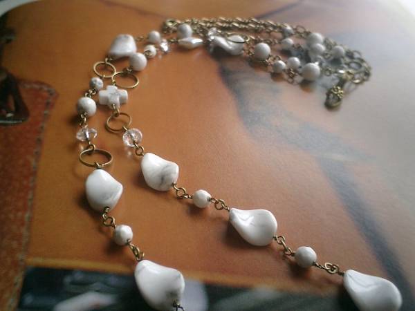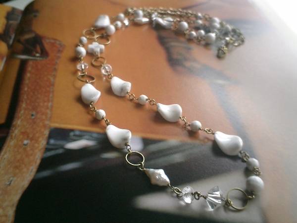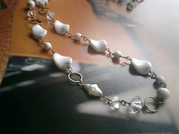 愛しいお気に入り・・シリーズです♪白の気品・・水晶とハウライトのネックレスです♪繊細なボタンカット、スターカットの水晶にシックな模様の6ミリ、8ミリのラウンドカット、12ミリのクロス、13×18ミリのツイストオーバルなど大きさ違い、デザイン違いのハウライトやクロスカットの淡水パールを合わせました♪オフホワイトでまとめて大人のロマンチックしています♪♪長さは全長109センチ位で調節自由です♪そのまま長く着けても2連にされても可愛いです♪♪お揃いのブレスレットやイヤリングも出品しています♪シンプルで飽きのこないいつまでも着けられるデザインを考えて作りました!ハンドメイドをご理解頂いてノークレーム、ノーリターンでお願いします