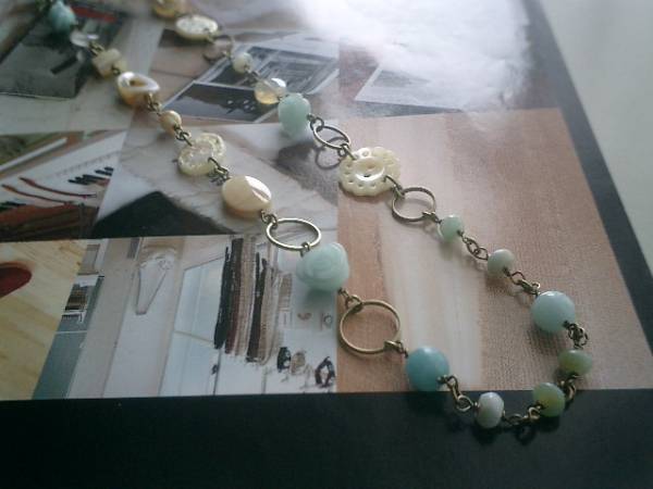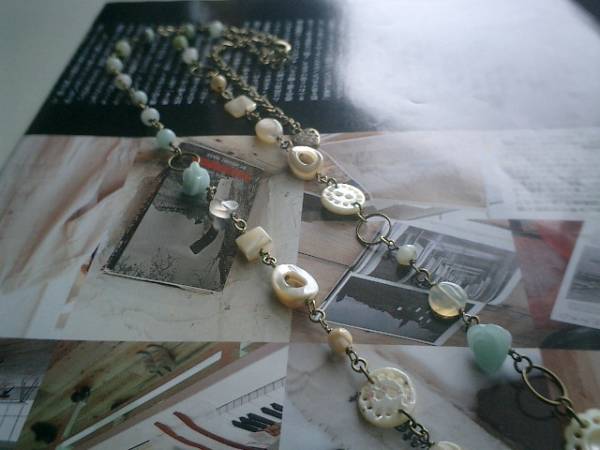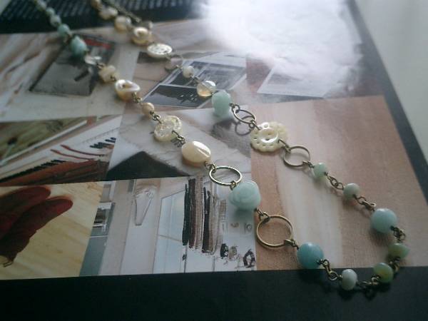 薔薇の帽子箱・・シリーズです♪巴里模様・・大人色でまとめたロマンチックなネックレスです♪シックなオフ・ベージュ色のマザーオブパールは6ミリ、8ミリの丸玉、10ミリ、14ミリのオーバルリング、8ミリ、10ミリ、12ミリのオーバルなど大きさ違い、デザイン違いです♪水色やグレー、グリーンなど個性的な色が可憐なアマゾナイトは6ミリのボタンや8ミリの丸玉、12ミリの薔薇です♪レース模様のような透かしシェルを合わせてアンティークモダンな表情です♪長さは全長90センチ位で調節自由です♪2連にされても可愛いです♪♪お揃いのネックレスやブレスレットも出品しています♪♪シンプルで飽きのこないいつまでも着けられるデザインを考えて作りました!ハンドメイドをご理解頂いてノークレーム、ノーリターンでお願いします
