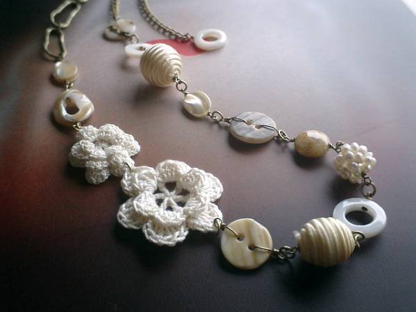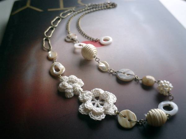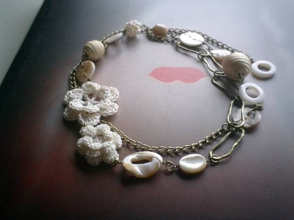 可憐なシルエット・・シリーズです♪アリスの夢・・オフ・ベージュ色でまとめた繊細でシックなネックレスです♪パリ(??)っぽいアンティークな雰囲気で作りました。13×18ミリ位、10×15ミリ位のオーバルリング、15×10ミリ位のオーバル、15ミリのリング、などのオフホワイトやベージュのマザーオブパールや12ミリ位の淡水パールボール、14ミリ位、18ミリ位のサテンボール、35ミリと30ミリ位の綿フラワー、14ミリから18ミリ位までのシェルボタン、12ミリ位の化石珊瑚などクラシックな雰囲気の素材を集めました♪♪画像のように2連にされても素敵です♪長さは全長88センチ位で調節自由です♪お揃いのネックレス3本セットも出品しています♪♪シンプルで飽きのこないいつまでも着けられるデザインを考えて作りました!お揃いのブレスレットも出品しています♪ハンドメイドをご理解頂いてノークレーム、ノーリターンでお願いします