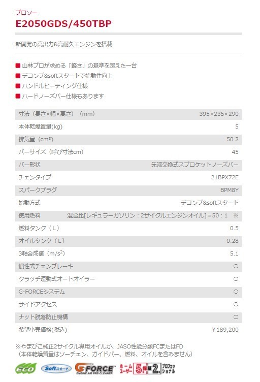 【商品詳細】 【新ダイワ E2050GDS/450TBP プロソー】 新開発の高出力&高耐久エンジンを搭載 ・山林プロが求める「軽さ」の基準を超えた一台 ・デコンプ&softスタートで始動性向上 ・ハードノーズバー仕様もあります 寸法(長さ×幅×高さ)(mm):395×235×290 本体乾燥質量(kg):5 排気量(cm3) :50.2 バーサイズ(呼び寸法cm) :45 バー形状 :先端交換式スプロケットノーズバー チェンタイプ :21BPX72E スパークプラグ :BPM8Y 始動方式 :デコンプ&SOFTスタート 使用燃料 :混合比[レギュラーガソリン:2サイクルエンジンオイル]=50:1 燃料タンク(L): 0.5 オイルタンク(L): 0.28 3軸合成値(m/s2): 5.1 慣性式チェンブレーキ :○ クラッチ連動式オートオイラー: ○ G-FORCEシステム: ○ サイドアクセス: ○ ナット脱落防止機構: ○ ※仕様は、予告なく変更する場合がございます。 ※北海道、沖縄、離島等、別途送料が発生する場合がございます。 ※混載便、車上渡し、日時不指定となります。 ■不明な点、ご心配事は事前にお問い合わせ下さい! メーカーホームページはこちらから株式会社やまびこ 重量物は法人様のみ車上渡し元払いになります。 個人様は、運送会社様の営業所止めになります。 ※下記注意事項の確認をお願いいたします。