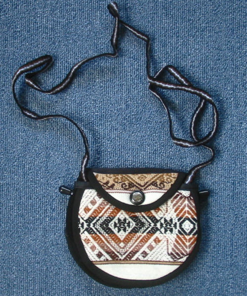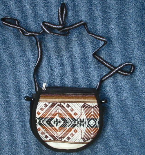 当商品は、ペルー民族織物(リャマ・インカ柄等)で作られた丸型ポシェットバッグです。