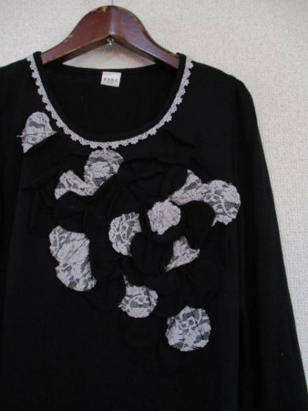 | 商品紹介 | 左から中央にかけて付いた大きな花モチーフがポイントになった 長袖カットソーです。 襟周りはグレー、袖口近くと裾には黒のレースが付いています。 本体と花モチーフは黒、花モチーフの一部はグレーのレースが使われています。 《素材》 本体:ポリエステル65% レーヨン35% 別布:ナイロン95% ポリウレタン5% レース:レーヨン80% ナイロン20% レース:レーヨン100% |