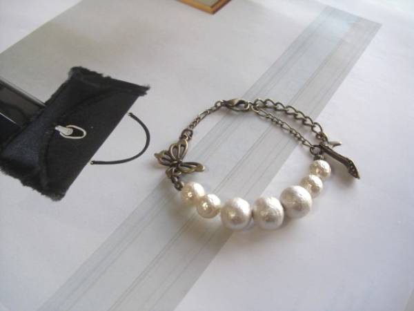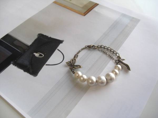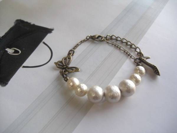 特別な一日・・シリーズです♪コットンパールと小さな蝶・・ふんわりやさしいオフホワイトのコットンパールのブレスレットです♪軽い着け心地で楽しんでいた だけます♪丸玉のパールに小さな蝶のメタルチャームを合わせてロマンチックな表情です♪10ミリ、8ミリの丸玉のパールに13ミリ位の蝶です♪長さは全長23センチ位で調節自由です♪お揃いのネックレスやイヤリングも出品しています♪シンプルで飽きのこないいつまでも着けられるデザインを考えて作りま した!ハンドメイドをご理解頂いてノークレーム、ノーリターンでお願 いします
