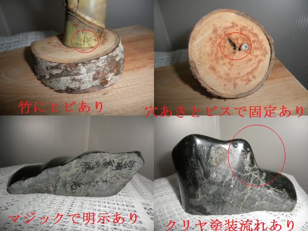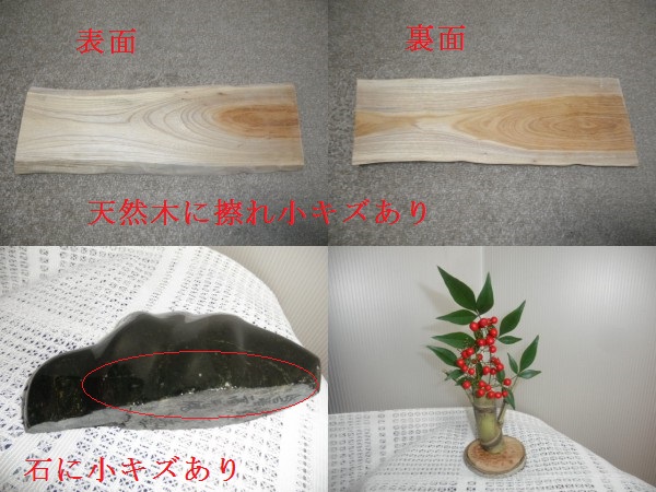 | 天然木のクスノキの花台おまけ付にオンジク石 竹の一輪挿しはいかがですか? お店のディスプレィ及びインテリアとしてあなた好みにアレンジできますよ! 画像で表示のように石は、ところどころ小キズ及びぐらつきがございます。また底部に宮崎県の高千穂オンジク石とマジックで書かれています。 またクリヤー塗装の一部が流れています。 天然木のクスノキは、一応ペーパーを軽く掛けていますが、ところどころにごくわずかな 擦れ、小キズが残っています。(塗装はしておりません。) ※竹の一輪挿しの南天は、イメージ画像です。落札時はついておりません。 全てを細かく書ききれませんので 画像で気になる点がございましたら、ご質問にてお願いいたします。 細かいことが気になるお方、完璧なお品をお求めのお方は入札をご遠慮くださいませ。 サイズ 石 横長さ17.3cm 高さ10cm 奥行7cm 重さ1200g 竹 高さ12.6cm 台座丸い木 口径7.7cm(切り口は水平ではございません 一部カットして斜 めになっております。 台座本体 横長さ42.2cm 巾14.5cm | |||
