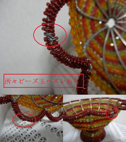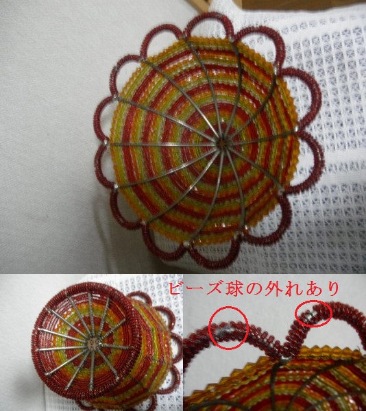| 昭和レトロ品です。フルーツ入れ? キャンディ入れ?小物入れ?等々多目的に活用になれます。 ハンドメイド品です。太い針金にサイズの大小様々なビーズ玉を組み合わせて作製されています。 画像表示のように所々にビーズ玉ハズレがございます。(そのため針金が見えています) そんなに気にならないと思います。 中古品の時代物ですので、ご理解納得されてのご入札をお願いいたします。 サイズ 口径21cm 高さ22.5cm 補償なし定形外円可 お願い事項です。 ♪一度は人のお手に渡ったお品になりますので、神経質なお方・些細な事が気になるお方、 または、新品をお求めのお方は、ご入札をお控えください。 ♪中古ですので、キズなど見落としがあるかもしれませんがノークレームノーリターンでおねがいします。恐れ入りますが、神経質な方はご遠慮ください。 ♪お客様のPC環境で、実物の商品の色と多少の誤差が生じる場合がございます。それらの点を十分ご理解いただいた上でご入札頂きますようお願い申し上げます。 ♪お客様の思い描くイメージが違うと言った返品はご勘弁ください。 ♪システム手数料・消費税、梱包代金等、一切頂戴致しておりませんので、ご安心して御落札下さい。 ♪発送は基本的に、ゆうパックでの発送になります。 ♪お安い送料を、ご希望される場合、補償はございませんが定形外可です。 ♪定形外郵便円(破損、不着の補償無し、追跡無しです。) ご理解ください。 ♪ゆうパック 80サイズ(持込割引120円引)となります ♪梱包材は原則的段ボールなど再生のものを利用しております。 プチプチで包んでしっかり丁寧梱包を心がけていますのでご安心ください。 ♪商品の説明及び注意事項に(同意されての上で)ご入札をお願い致します | |||