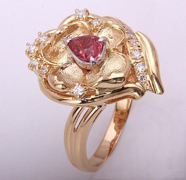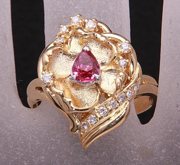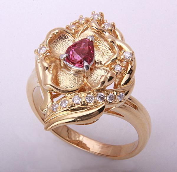 ペアシェイプのルビーが中央に輝くデザインリングです。