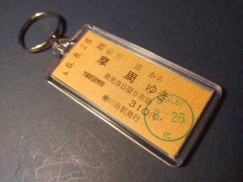・使用済みの硬券(実際に使用された切符・B券)を、透明キーホルダーにしたものです。