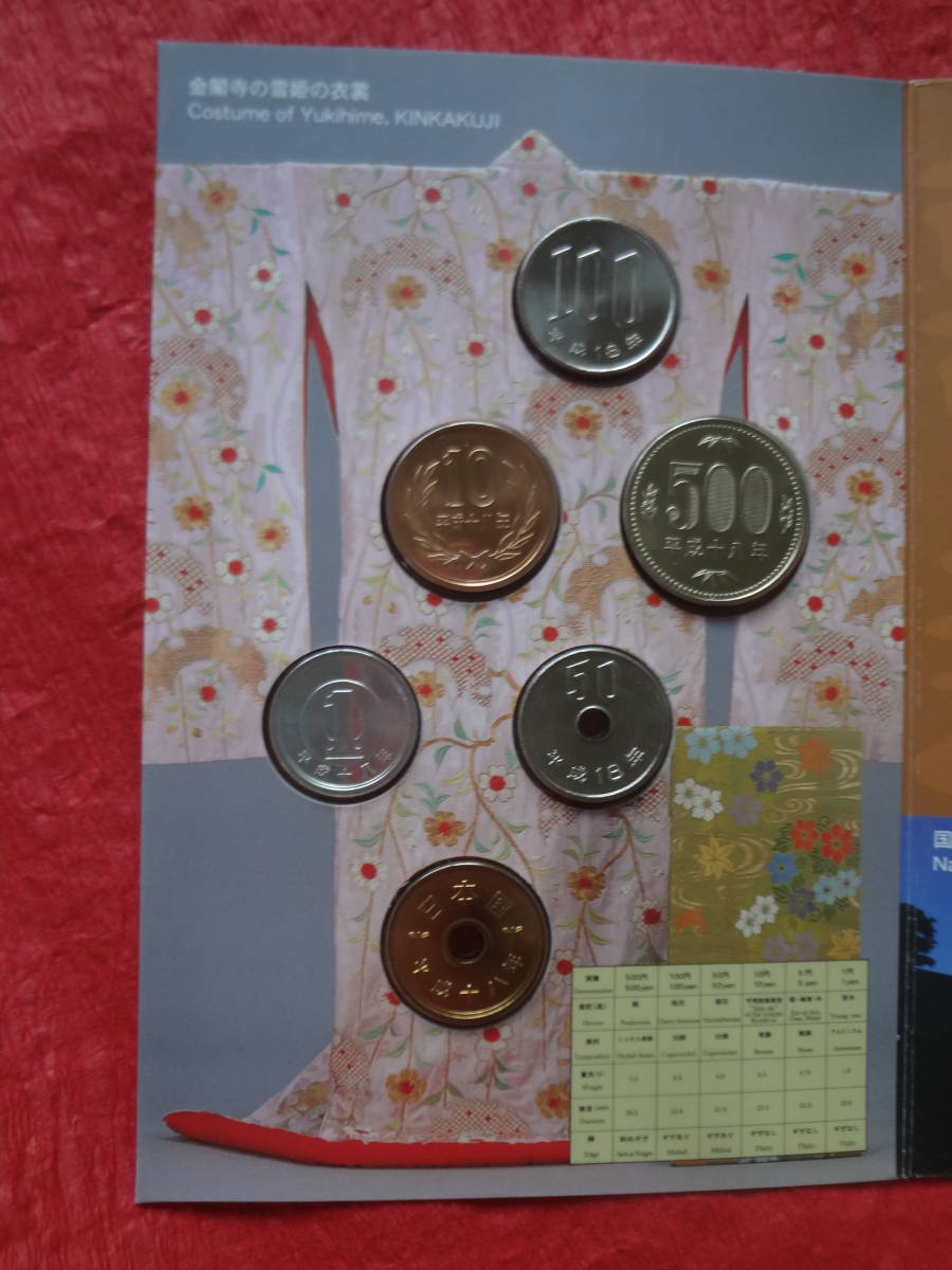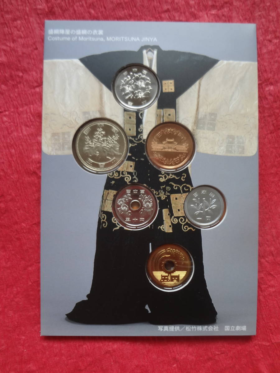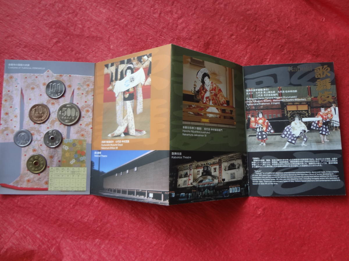 この貨幣セットは、「歌舞伎」が200511月に第3回「人類の口承及び無形遺産の傑作の宣言」の傑作に選ばれたことを記念して、造幣局で製造した一度も使用していない平成18年銘の500円から1円まで計6枚の通常貨幣を、歌舞伎に関わるカラー写真と和・英文の説明文を入れた絵はがき型の特製ケースに収納したものです。
