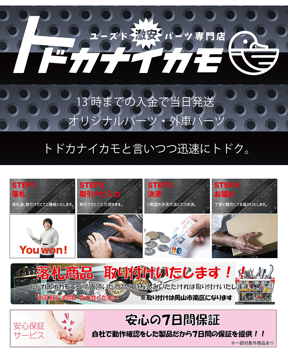 領収書、納品書、請求書の発行は致しかねますのでご了承下さい。 尚、壊れやすい商品は当方の判断で保険を掛けますのでご了承下さい。 年末年始、ゴールデンウィーク、お盆は対応が遅れる場合がございます。 お急ぎのところ恐縮ですがご理解下さると幸いです。 キズ等、写真に写らない場合が御座いますので神経質な方は入札をご遠慮ください。 落札者様の都合でのキャンセルは受け付けません。 中古品ですのでノークレーム・ノーリターンでお願い致します。 外装部品については修復歴(板金等)は詳しくは分かりませんのでノークレーム・ノーリターンでお願い致します。 実動品と書いて有る商品に関しては不動の場合のみ返品を受け付けますが商品到着後1週間以内にご連絡お願い致します。 商品到着後1週間を過ぎると、いかなる場合(動作不良等)に尽きましてもクレームは受け付けませんので宜しくお願い致します。 ジャンク品の定義は不動物と致します。 商品をご使用になられたことによるお怪我、搬入等によるお車。ご自宅への損害等、また 商品の脱着工賃・脱着によるお車への損害等、すべての損害金はお支払い出来ませんので了承の上、入札をお願い致します。 落札後の取引方法は取引ナビにてご連絡致しますのでご確認、宜しくお願い致します。 又、取引ナビへの入力は落札後24時間以内で必ずお願い致します。 又、入金処理は落札後3日以内で必ずお願いします。 |