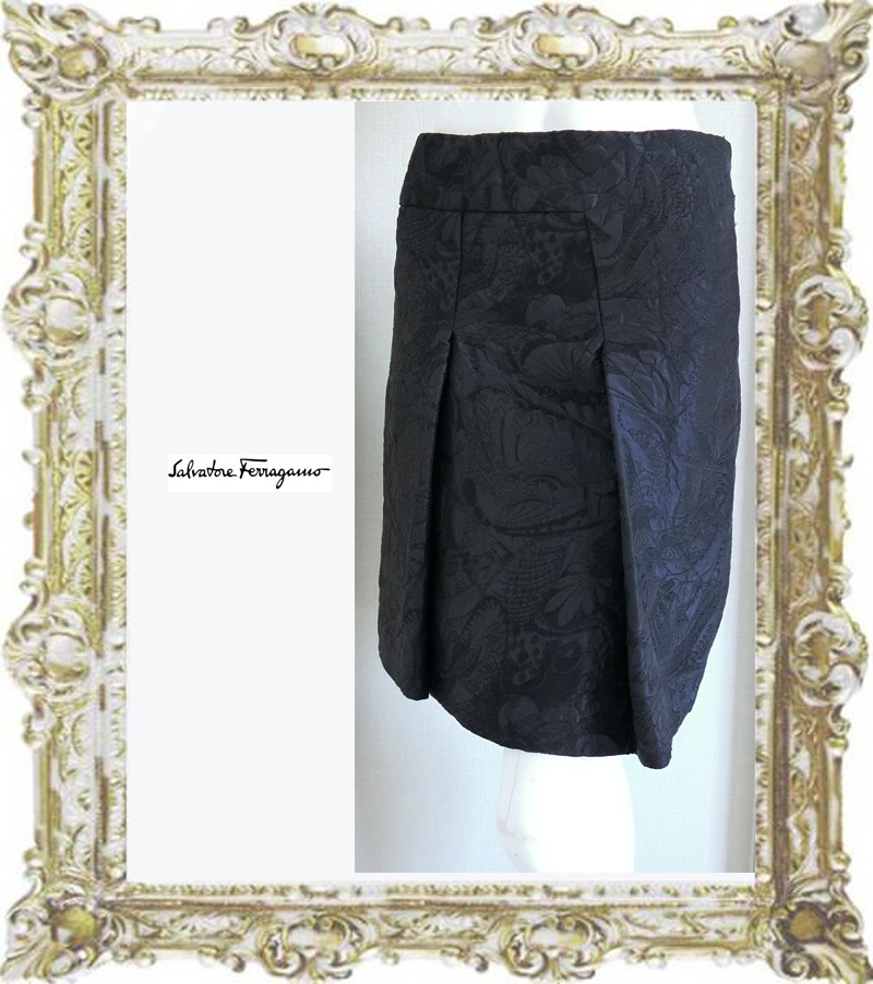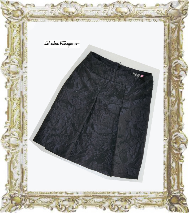 サルヴァトーレ フェラガモ 紺色 ペイズリーステッチ刺繍生地 スカート38