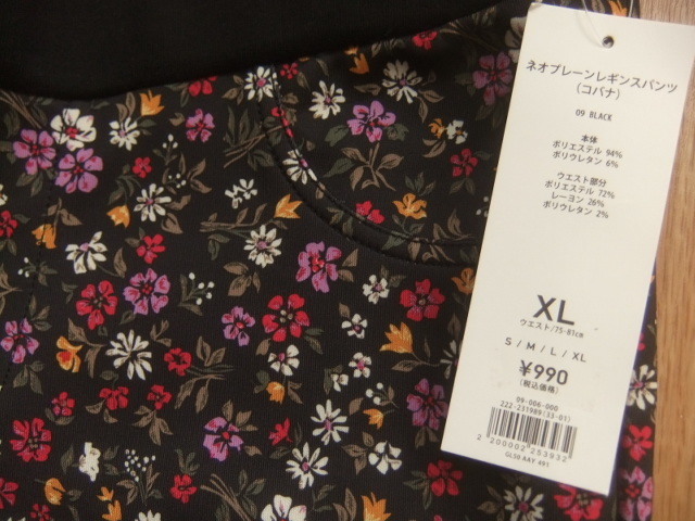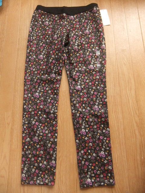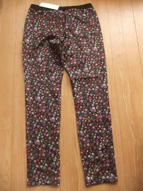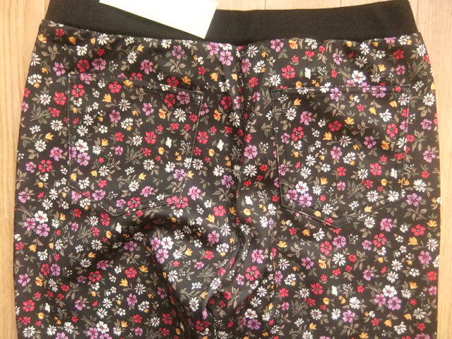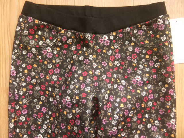 新品タグつきの、軽くてストレッチ性のある黒地にピンク系小花柄をあしらったレギンスパンツです。