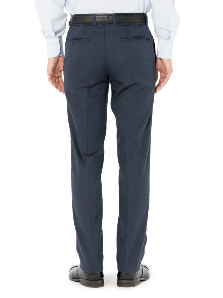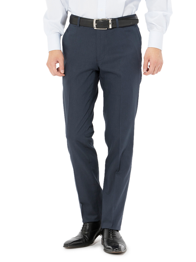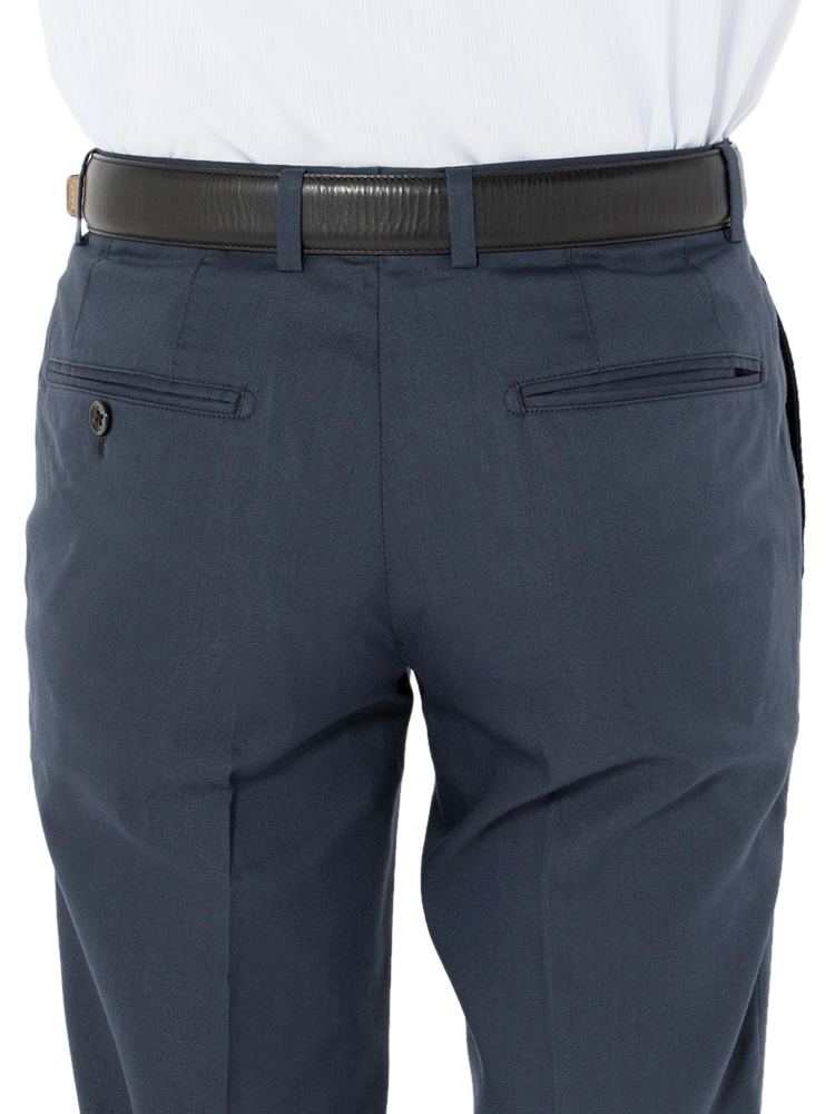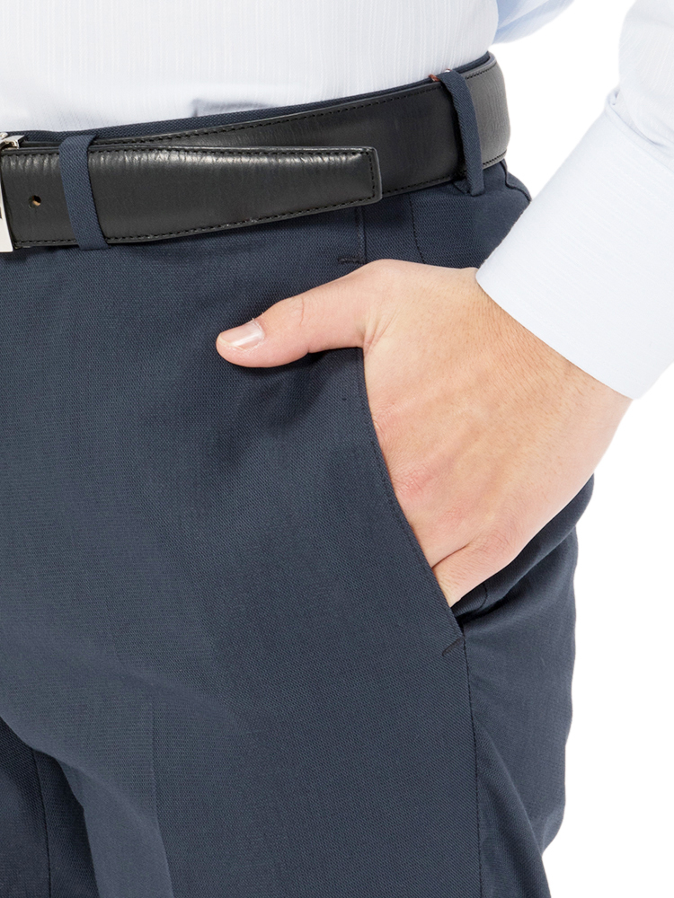 東レの快適素材「クールモーション(R)」を採用した、ビジネスコットンパンツです。汗をすばやく吸収しすぐに乾かす吸湿速乾性に優れ、これからの時期に重宝する高機能パンツ。接触冷感によるひんやりとしたクール感を味わえ、暑い夏も快適さをキープします。前後にしっかりとかけたセンタープレスや、裾に向かって緩やかにテーパードさせたシルエットが、レッグラインをスマートに演出。スッキリとしたノータックデザインで、着用する人の年代を選びません。バックポケットは両玉縁デザインにし、左側のみボタン留めにしてアシンメトリー仕上げにしました。ジャケットとのコーディネートはもちろん、シャツやポロシャツを合わせたクールビズスタイルにも活躍。無地のネイビーで落ち着きがあり、様々なシーンに取り入れられます。