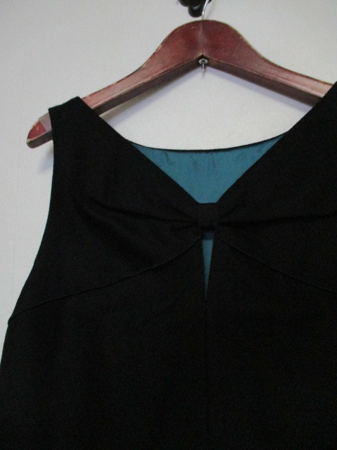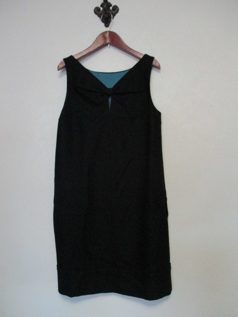 商品紹介 | 胸元のリボンモチーフがポイントになったワンピースです。 色は黒です。 形はほぼタイトです。 着用時には見えないですが、 落ち着いたエメラルドグリーンの裏地が付いています。 《素材》 表地:ウール100% 裏地:キュプラ ※割合の記載なし |