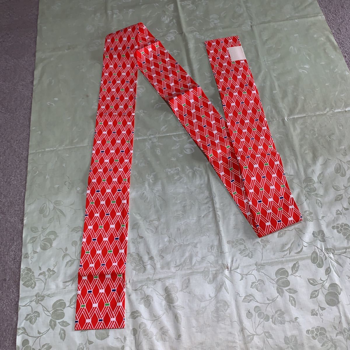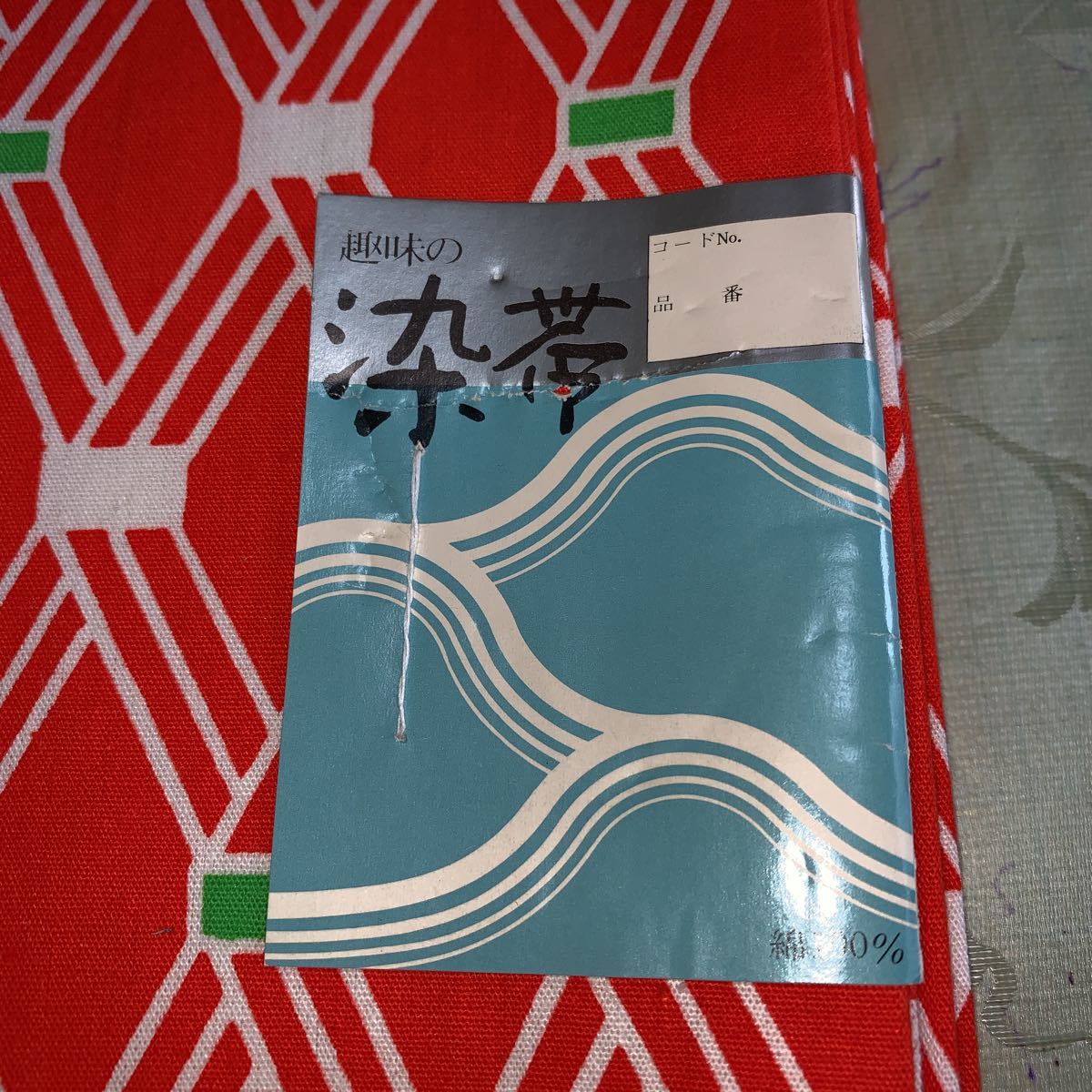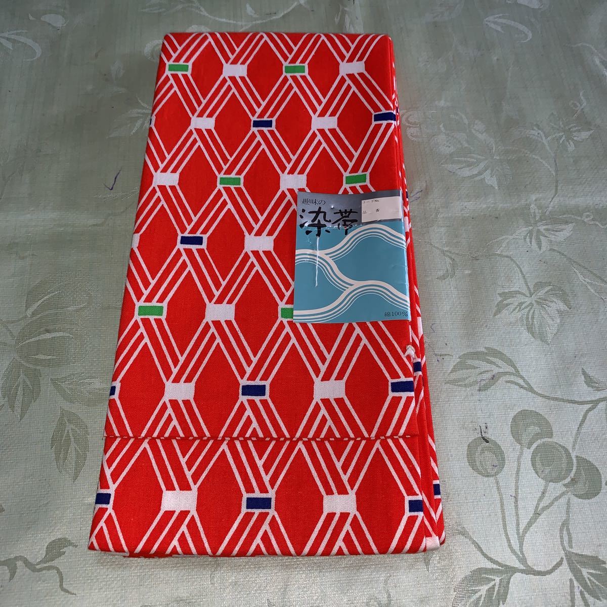 ■未使用 半幅帯 染帯 絹 うす赤地 白黄緑 紺 白の菱形線柄■