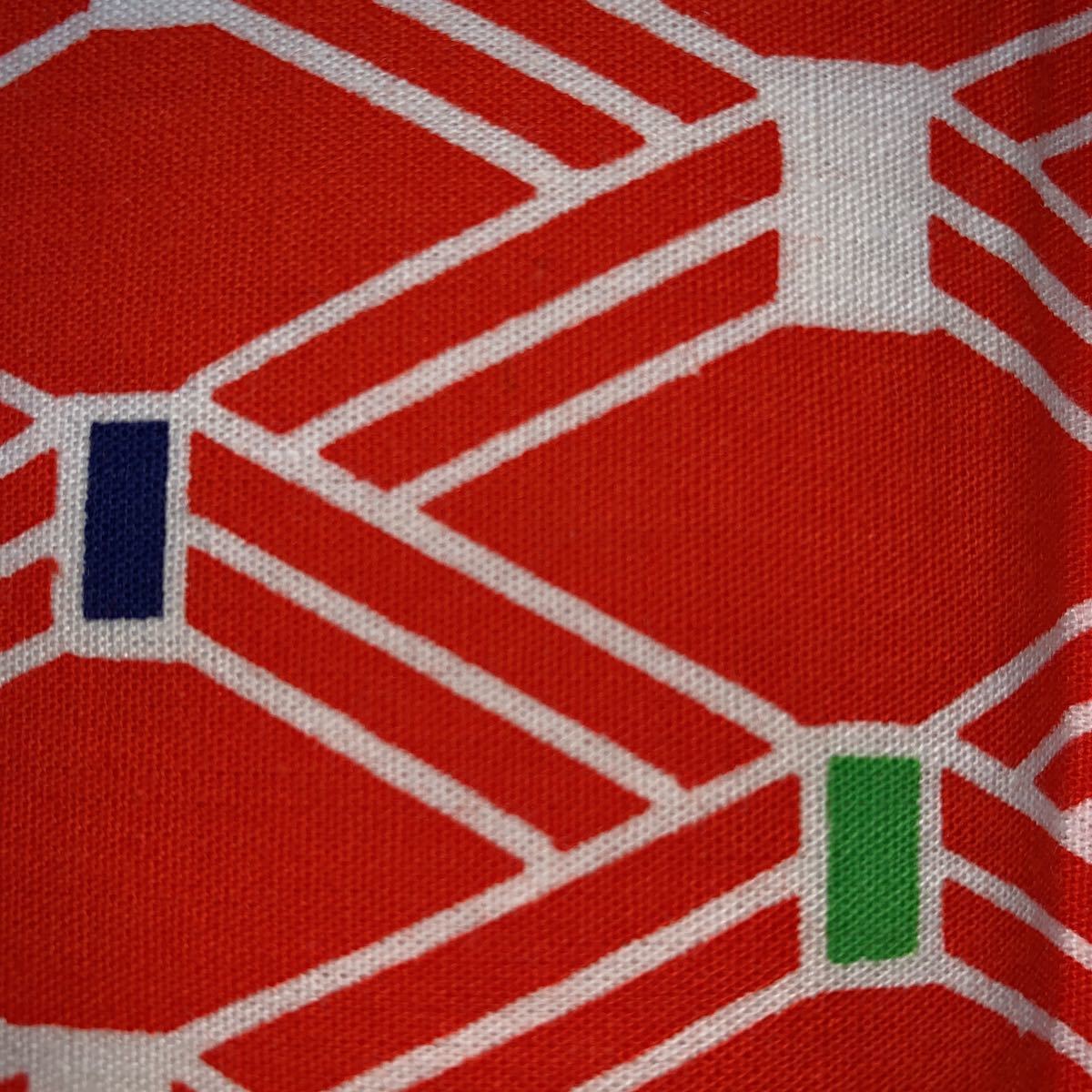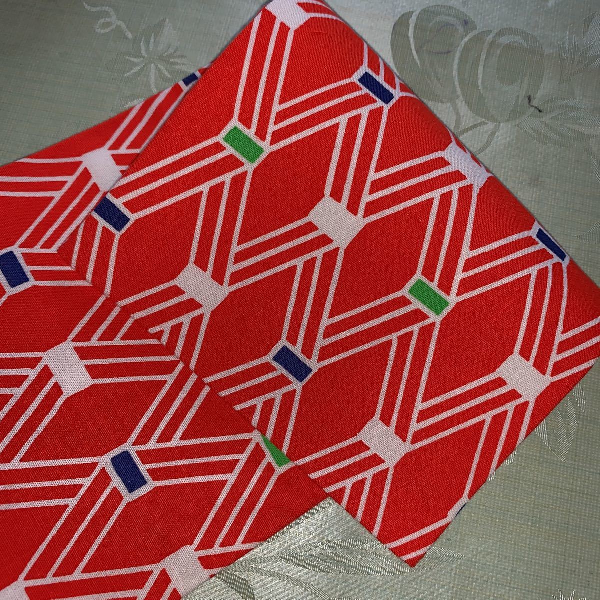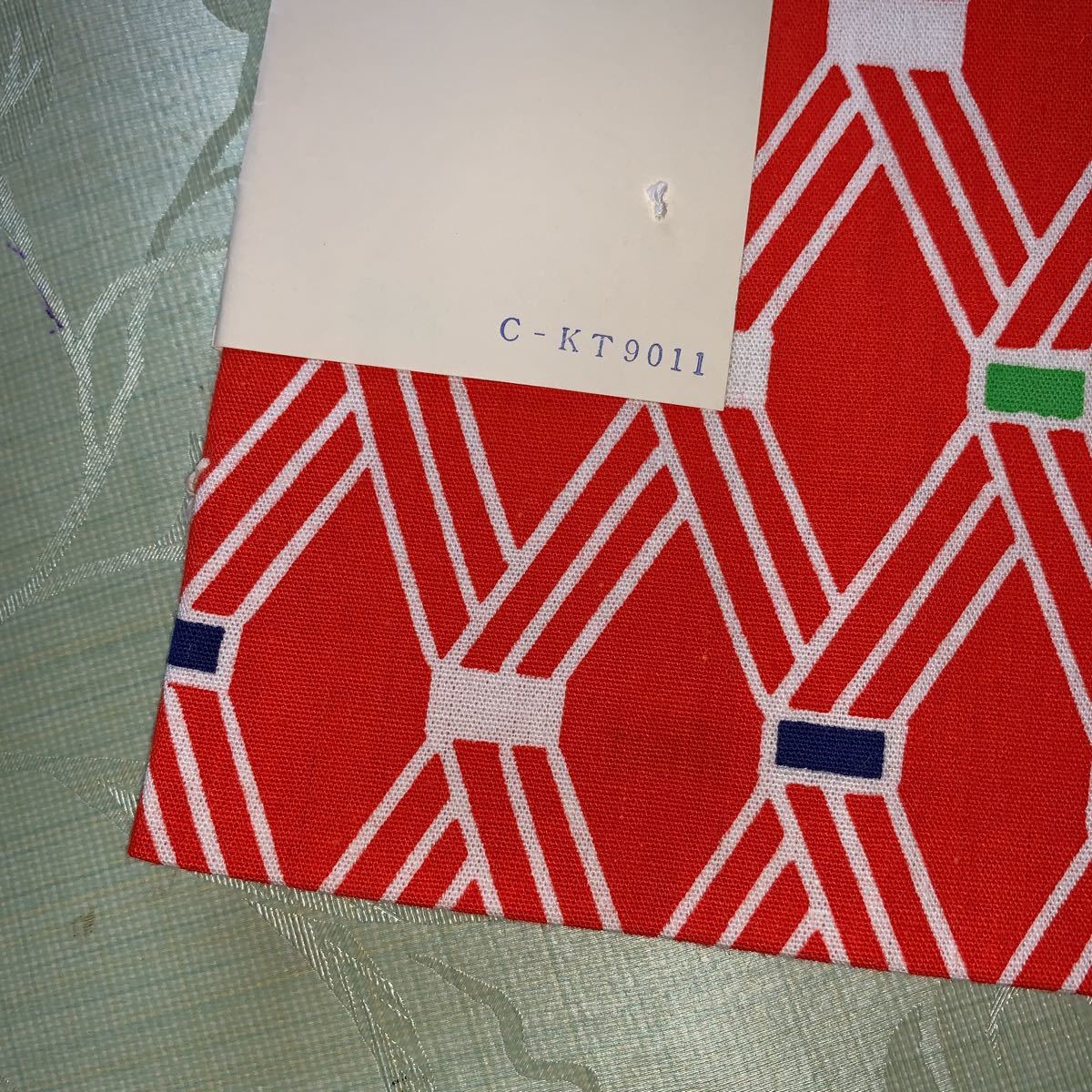 ■未使用 半幅帯 染帯 絹 うす赤地 白黄緑 紺 白の菱形線柄■