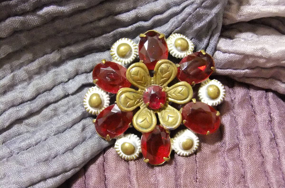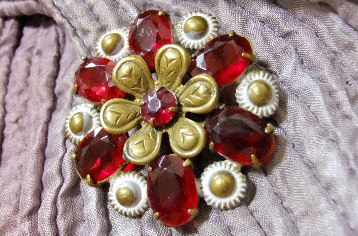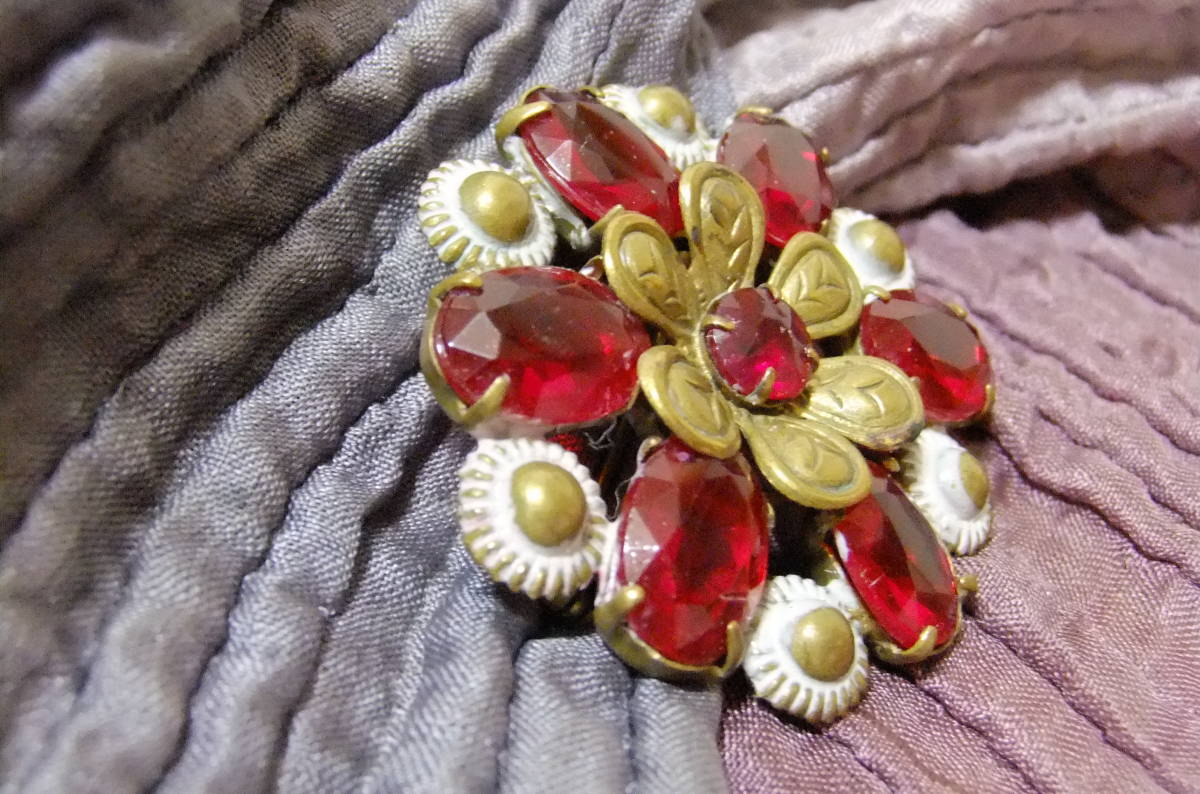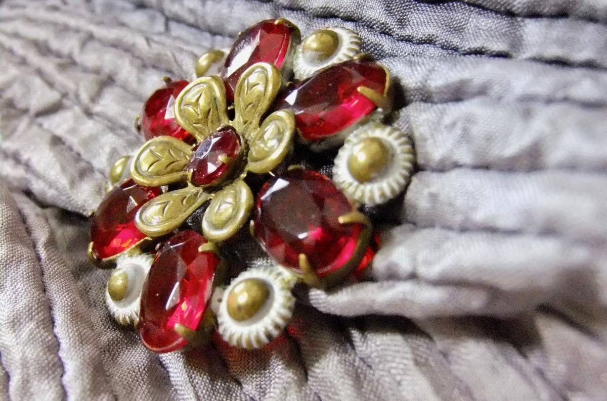 イギリスで購入したフラワーモチーフ、レッドカラーストーンのブローチ。