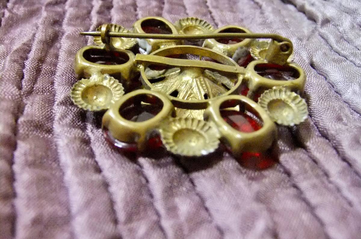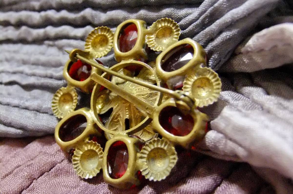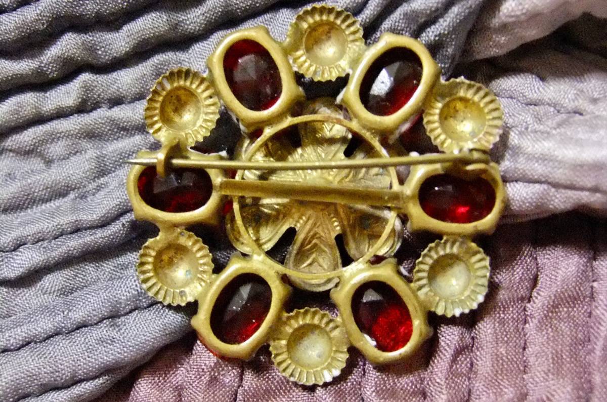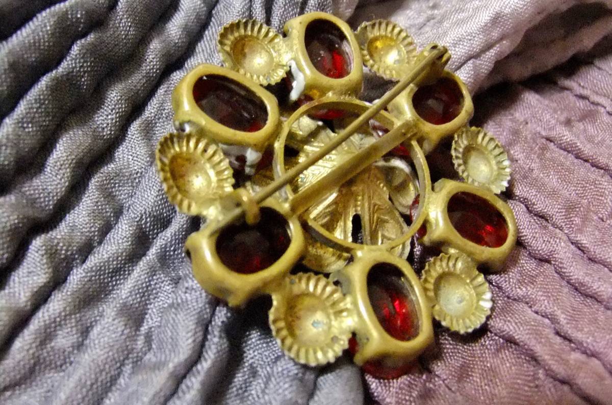 イギリスで購入したフラワーモチーフ、レッドカラーストーンのブローチ。