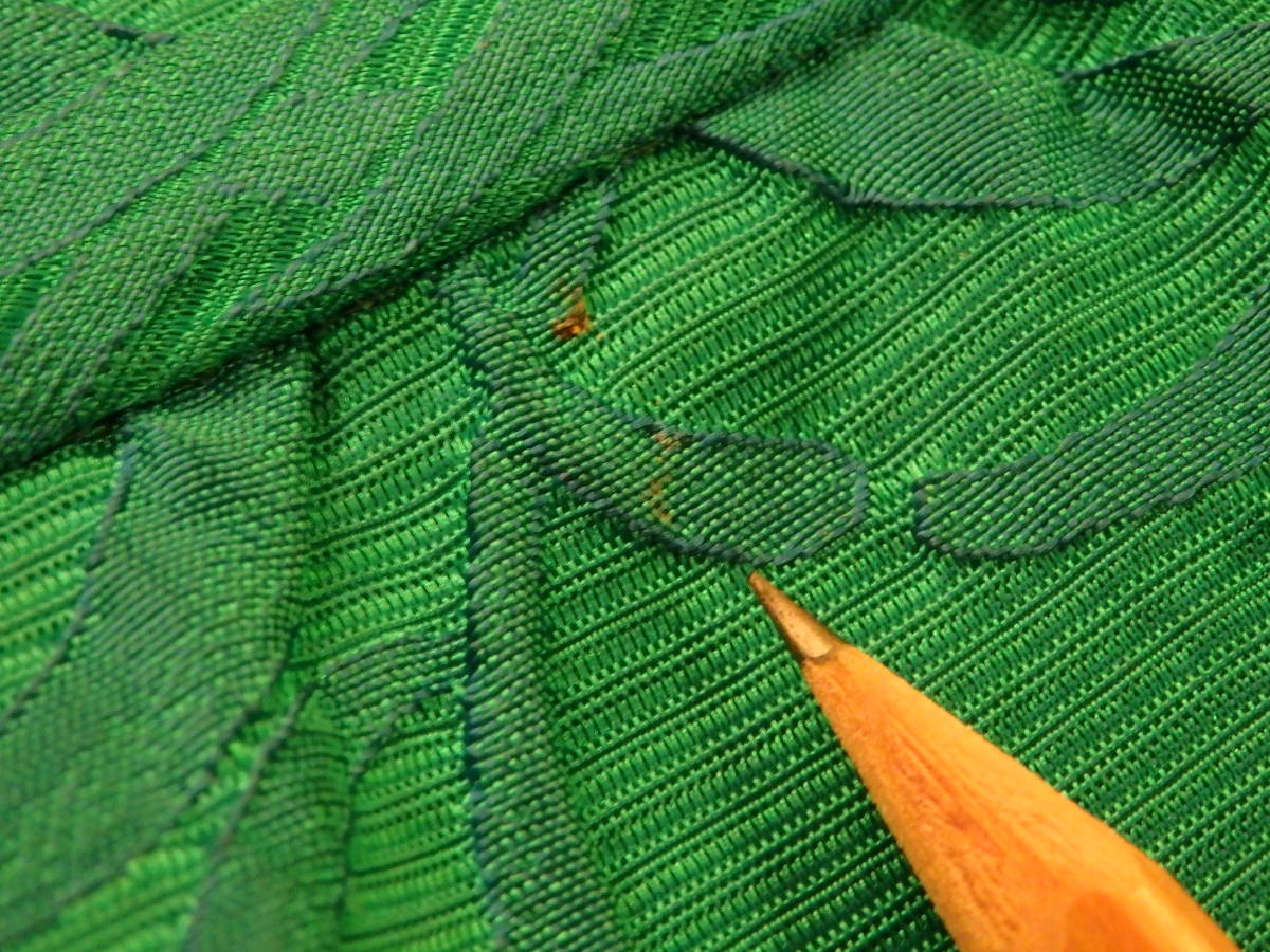 カラー エメラルドグリーンベースに青緑のリーフ模様(カメラの性質上、色味が違って写ります。実物は緑味が強いですが、光沢がある織り生地の為、光の当たり具合で青味よりに見えることもあります)