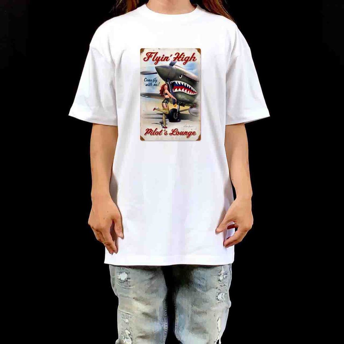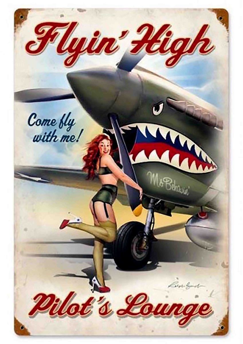 サメの口が描かれた戦闘機とピンナップガールのいかにもなビンテージレトロ看板デザインです。