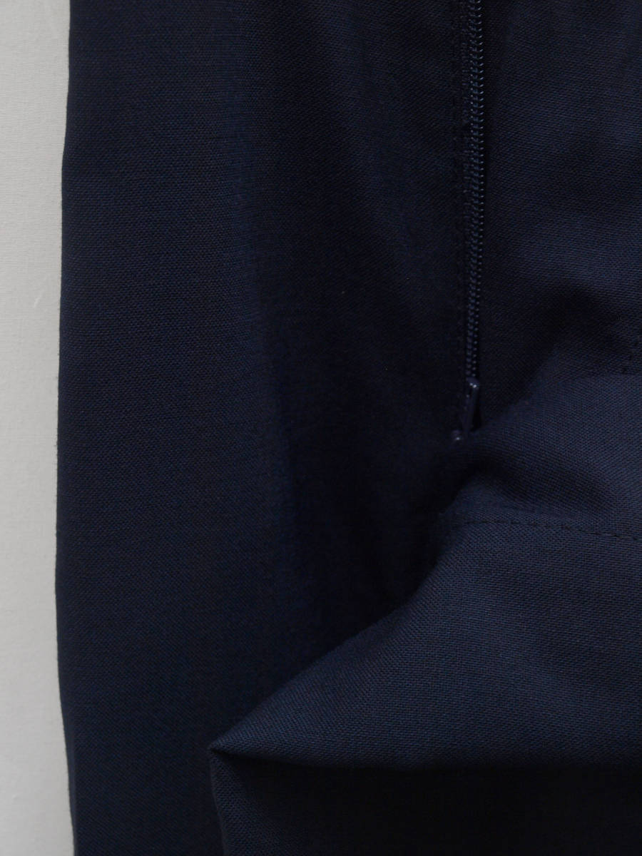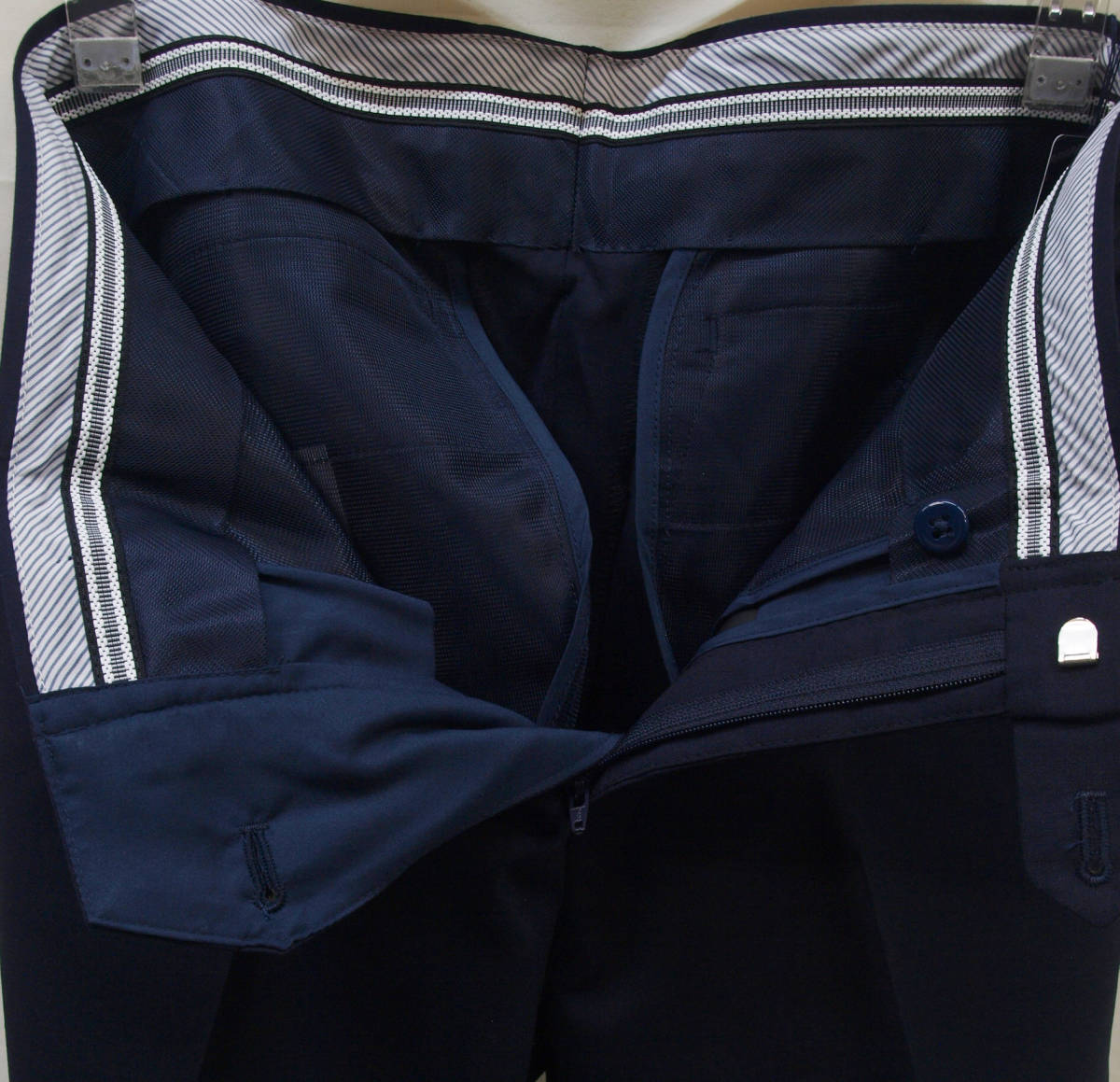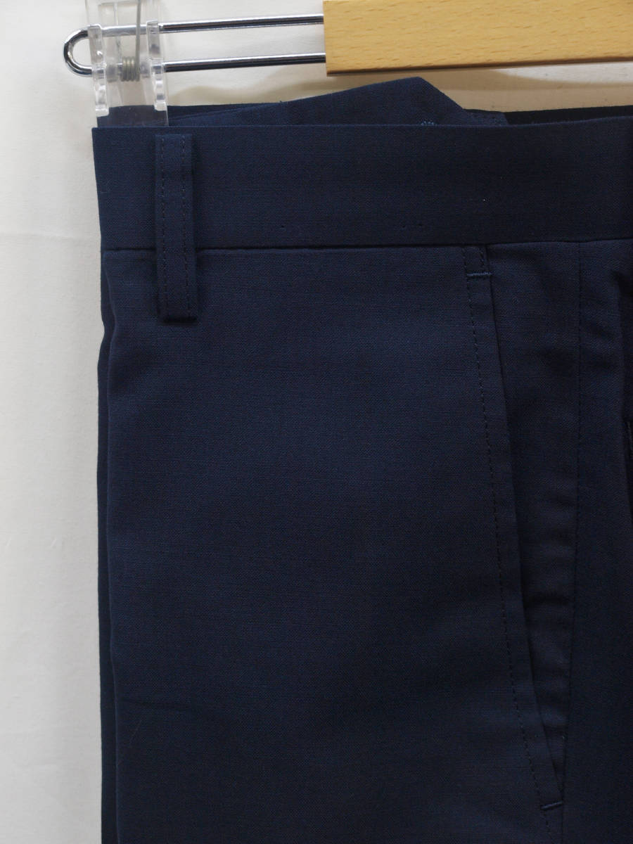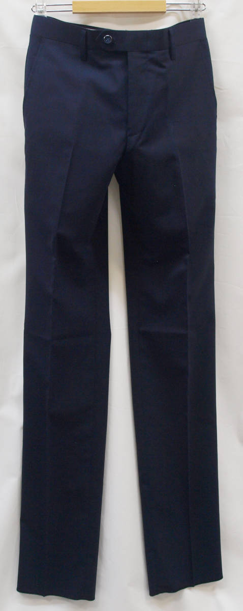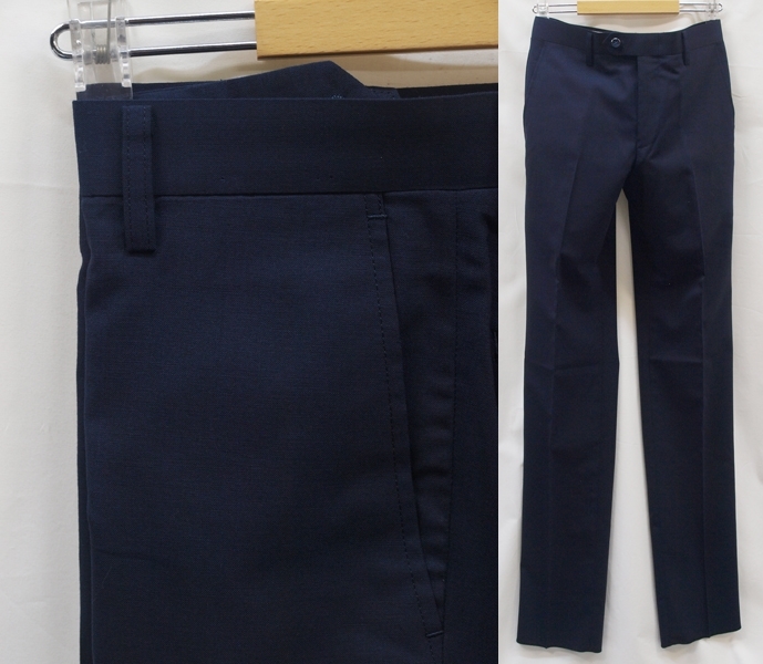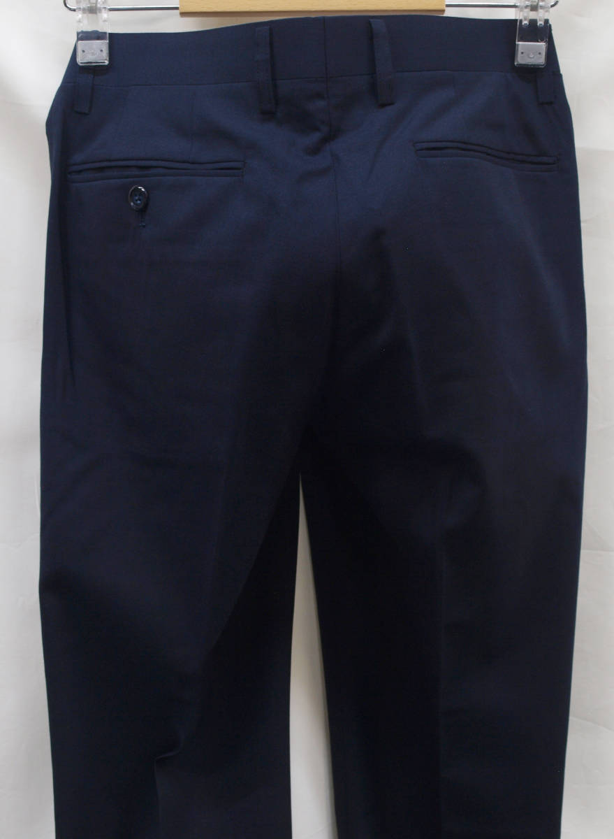 ■ ■ 【表記サイズ】 76cm 【実寸】 胴回り 76cm 平置きでかるくはかると74cmでひっぱってきっちりはかると76cmです。 渡り幅 30cm(股下すぐの部位) 股下から10cm下の部位で27cm 股上 22.5cm(前股上 24.5cm) 股下 90cm 裾幅 19.3cm(新品・裾上げ未処理の状態) ■ ■ 素材/色など商品説明 ■ ■ 【素材】 ウール(毛)50% ポリエステル50% 【色/柄】 濃紺色無地 しなやかでさらっとした肌触り、ほど良い張り/清涼感のある春夏向けの紳士スーツに使われる薄手のウールブレンド素材を使用 【仕様等】 ノータック/シック付き/膝裏あて付き(前身ヒザ下までの裏地)/脇ポケット斜め付け/後ろポケット、両玉縁で左にボタン付き/シャツ滑り止め付き、ウォッシャブル(WASHABLE)対応(ネット使用、弱水流、水温40℃以下) 腰まわりの裏地やポケットにはメッシュ素材を使用しており普通のポリエステルの裏地と比べると通気性があり軽量で清涼感があります。(ポケットの縁はパイピングで補強しております。) 【デザイン】 極端にタイトではないですが、股上はやや浅めでもたつきのないすっきりとしたタイトシルエットで程よい細さのオトナのノータック、スリムフィット、ビジネススラックス。 縫製仕様もちゃんとしており、スーツ下のパンツみたいにきちんと感があり、ご家庭でお洗濯が可能なのでクールビズシーズンのビジネスシーンに 使いまわしのきくパンツです。 春~夏~秋口にかけて春夏メインのシーズンに対応致します。 ■ ■ お直しについて ■ ■ 別途料金にてお裾お直しを承っております。 お裾直しをご希望される場合、ご落札後、取引メッセージにてご連絡下さい。 料金は、シングル仕上げ1100円/ダブル仕上げ1300円/ウエスト詰め出し 1500円 (3~4cm程度までの直し)でございます。 オークション終了後、取引メッセージにてご指示下さい。 かんたん決済お支払い時、送料にプラスしてお支払頂くかたちになります。 お裾直しをうけたまわった場合、平日3~5日程(土日祝、夏季、冬季休業日除く)、出来上がりまでに日にちがかかってしまい、返品やサイズ交換などは出来か ねますことをご了承下さい。 ■ ■ お支払い&配送方法&送料等 ■ ■ お支払いはかんたん決済のご利用となります。 配送方法は一部地域を除いて佐川急便(袋/60~80サイズ)のご利用になります。 送料は、本州、四国/800円 九州/1200円 北海道/1300円 です。 離島もしくは一部地域は上記送料でゆうパックの利用となります。 ご面倒をお掛け致しますが沖縄県への配送の場合、ゆうパックのご利用(岐阜県から60~80サイズ)となりますのでお問い合わせ下さい。 到着日時、お時間指定帯(午前中/12時~14時/14時~16時/16時~18時/18時~20時/19時~21時)のご指定可能。 複数ご落札頂いた際、同時梱包/まとめて配送で送料は1点分にてお送り致します。 ヤフーかんたん決済お支払いお手続きが完了次第、定休日(土日祝)除く毎17時締めにて即日発送致します。 毎平日17時頃までの発送業務となります。 ご入金確認後、即日発送を心がけておりますが、土曜日、日曜日、祝日、 夏季(8月13日~8月16日)、冬季(12月30日~1月4日)とお休みを頂いておりますので、 その間御入金を頂いた場合、翌平日の発送となりますことをご了承下さい。 ■ ■ コメント ■ ■ 新品ですが在庫に限りが御座います為、大変申し訳御座いませんが、ノークレーム・ノーリターンにてどうぞ宜しくお願い致します。 K09---32--- |
