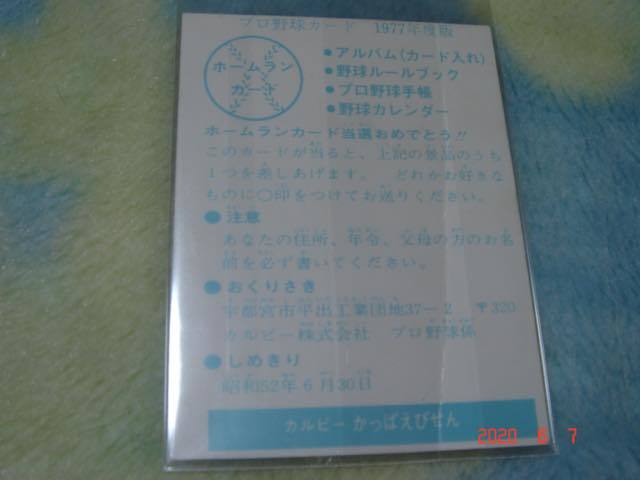 *1977年に、カルビー製菓から発売されました、プロ野球スナックのホームラン・カードです。