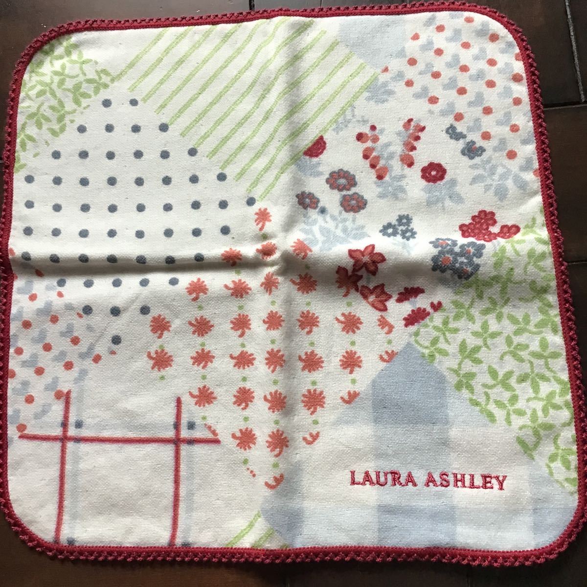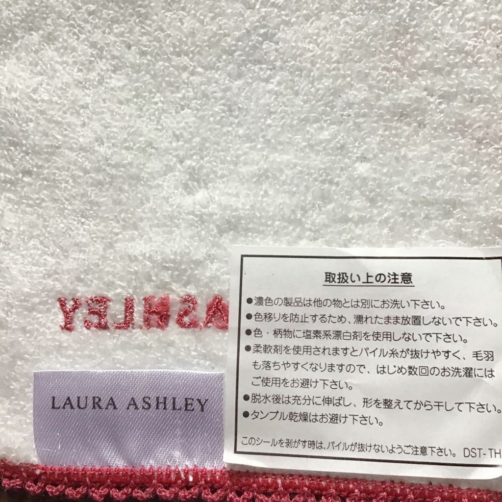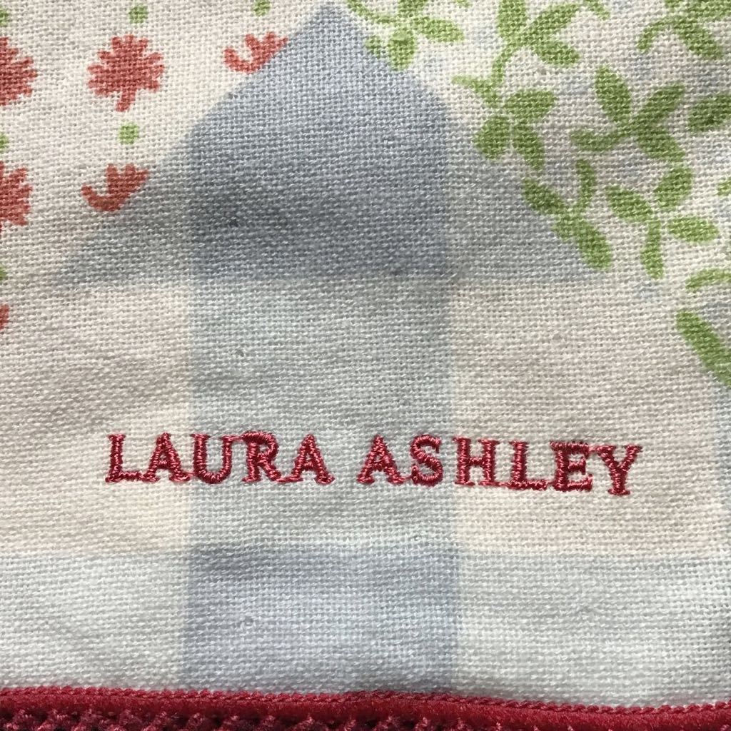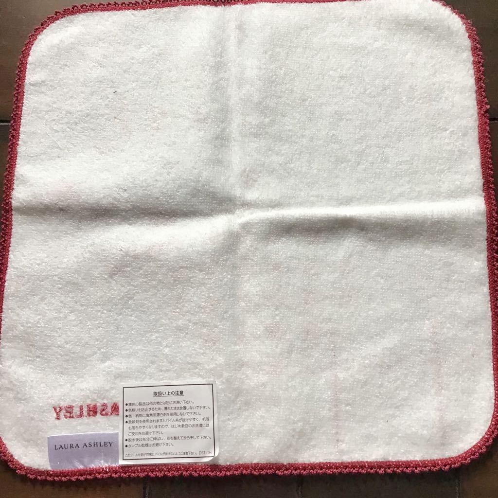 ローラアシュレイ♪周囲のレースが素敵なガーゼタオルハンカチです♪ローラアシュレイのロゴがエンジ色で刺繍された、とても綺麗な新品タグ付ですが、箱入りされた時の折り目がありますので、細かい神経質な方はご遠慮ください。