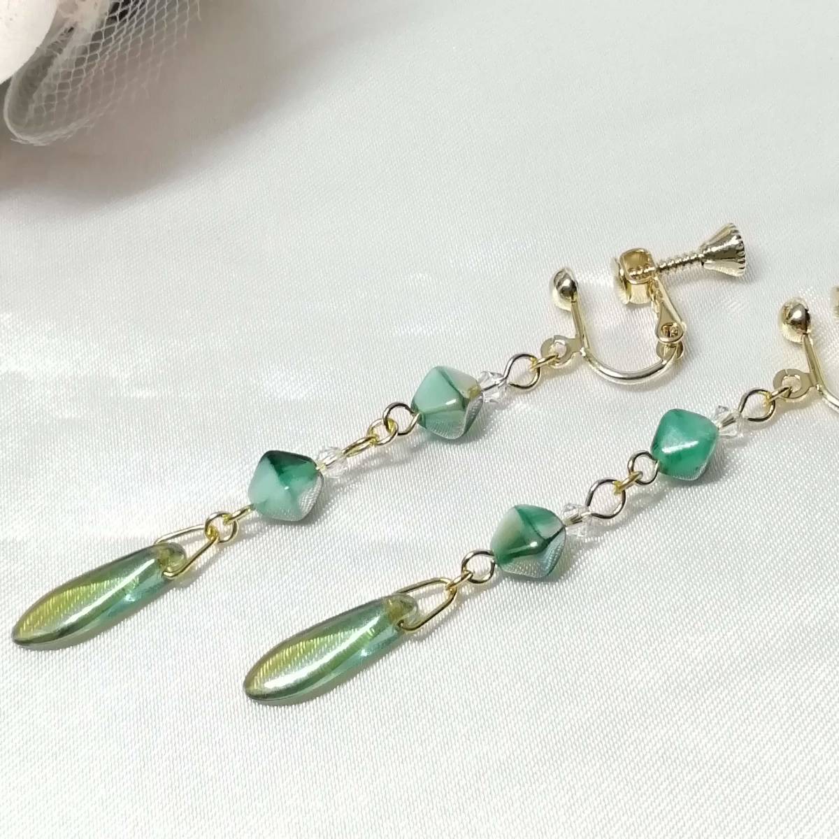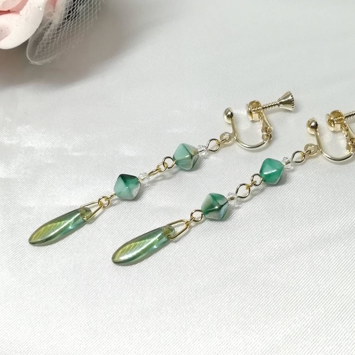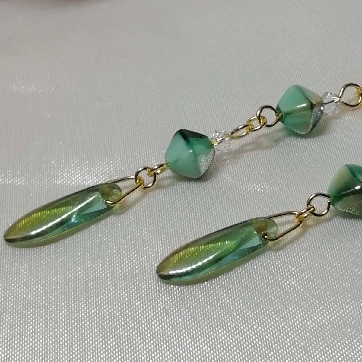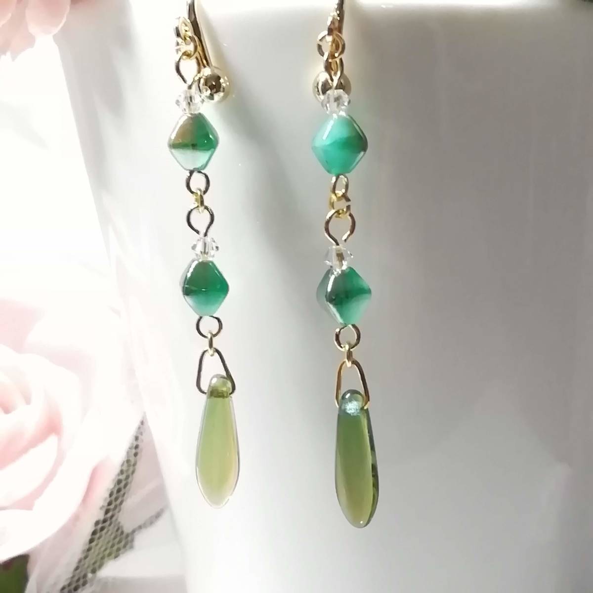 | ★商品内容★ チェコビーズグリーンマーブルとアクアマリンセルシアンダガーのハンドメイドイヤリング★上品/ゴールド/ダガー/グリーン/チェコ/クリスタル グリーンノートのダガービーズと、 グリーンマーブルの爽やかな色合いのイヤリングです。*・.**.☆・。**.・**. 吊る下げたビーズが襟元で良く揺れて 優雅で優しい女性らしさを印象付けるひと品です*・.**.☆・。**.・*・**。・ シンプルなデザインで、普段使いはもちろん、 お洒落のワンポイントにも最適です*・**.☆・。**.・**。 【素材】 チェコビーズダイヤ型グリーンマーブル6mm チェコビーズダガーアクアマリンセルシアン(チェコ産)16mmx5mm スワロフスキー5328クリスタル(オーストリア製)3mm 小粒チェーンゴールド カンより垂れ下がる長さは、約5.3㎝です。 Eー704 ★注意事項★ ***~ご購入前に必ずお読み下さい~*** *・*・*落札後について*・*・* *落札後4日以内にお手続き、ご連絡が無い場合は落札者都合で削除致します。 *発送日指定・ご入金の予定が1週間以上先をお考えの方は、入札の前に質問よりご連絡くださいませ。 予めご了承の上、ノークレーム・ノーリターンでお願い致します。 *・*・*商品について*・*・* *一点一点心を込めて作っておりますが、手作りなため多少の歪み等あるかもしれません。 手作りの味わいと、世界で一つだけの作品とお考えいただければ幸いです。 *デリケートな商品ですので、強く引っ張ったりすると破損する事もあります。 お取り扱いにはご注意ください。 *ご覧のPC、スマホによっては画像と実物の色味が多少異なる場合があります。 *基本イヤリング金具は跳ね上げネジ付き金具にて作成しております。 **ご希望によりピアスへの変更も承っております。 【フックピアス…無料/キャッチピアス…別途追加料金120円が必要です。】 *その他…樹脂ノンホールピアス(無料)・カン付き樹脂ノンホールピアス(別途追加料金20円が必要です。)にも変更をお受け致します。 ~ご注文の際にメッセージ欄よりお申し付け下さい~ 尚、金具変更のご希望が無い場合は、掲載された写真の金具にてお送り致します。 *金属アレルギーや化学物質アレルギーなどへの対応はしておりませんので、ご心配な方はご遠慮下さいますようお願い致します。 *永くご愛用頂くために、ご使用後は柔らかい布等で軽く拭いてください。 *・*・*プレゼント用梱包のご要望もお受けいたします*・*・* *その際は、梱包費用が別途で必要となりますのでご注意ください。 また、ご希望の梱包タイプによって、発送方法が変わりますので、送料が別途必要となります。 プレゼント用梱包タイプ 【袋→100円】 発送方法【クリックポスト(送料無料)】 プレゼント用梱包タイプ 【箱→200円】 発送方法【レターパックプラス(別途520円)】 袋タイプは【合計100円の追加料金が必要です。】、箱タイプは【合計720円の追加料金が必要です。】となります。 ◆ご希望の場合は、必ず商品ページをウォッチリストに登録した上で落札前に質問にてお問合せ下さい。◆ ◆ご希望を承り次第、一度出品を取り消し、プレゼント用梱包費用、送料などを追加した金額へ変更し、再出品致します。◆ *再出品後に再度検索して頂く手間が省けますため、プレゼント梱包をご希望の場合は必ずウォッチリストへのご登録をお願い致します。 金額変更後の再出品から3日以内に落札されなかった場合、誠に勝手ながら購入する意思がないとみなしまして、元の金額へ修正致します。 また、修正後、再度プレゼント用梱包のご希望のお問い合わせを頂きましても、お断りをさせていただきますのでご注意ください。 ご不明な点がございましたら、落札前に質問よりお願い致します。 ***ご質問について*** *ご購入前にお願い致します。 日中は仕事をしておりますので、ご返事が直ぐに出来ない場合がございます。 出来る限り早い対応を心がけますが、ご了承ください。 また、発送までには、お振込み確認後、翌日の発送を心がけておりますが、仕事の都合により2~3日程かかる場合がございます。(その際にはナビにてご連絡いたします) お急ぎの場合は、極力対応いたしますが、場合によっては対応致しかねる事もあります。ご了承下さいませ。 | |||
