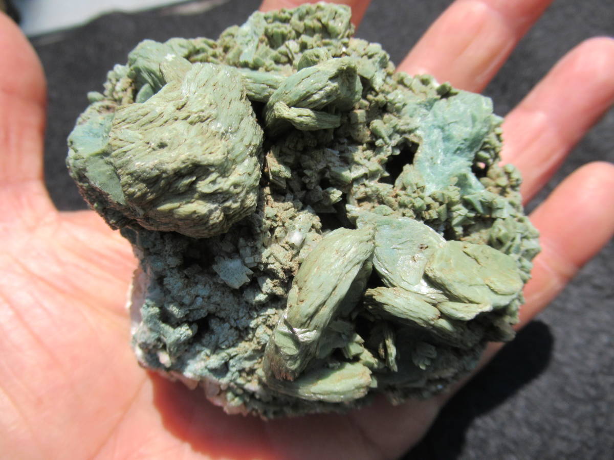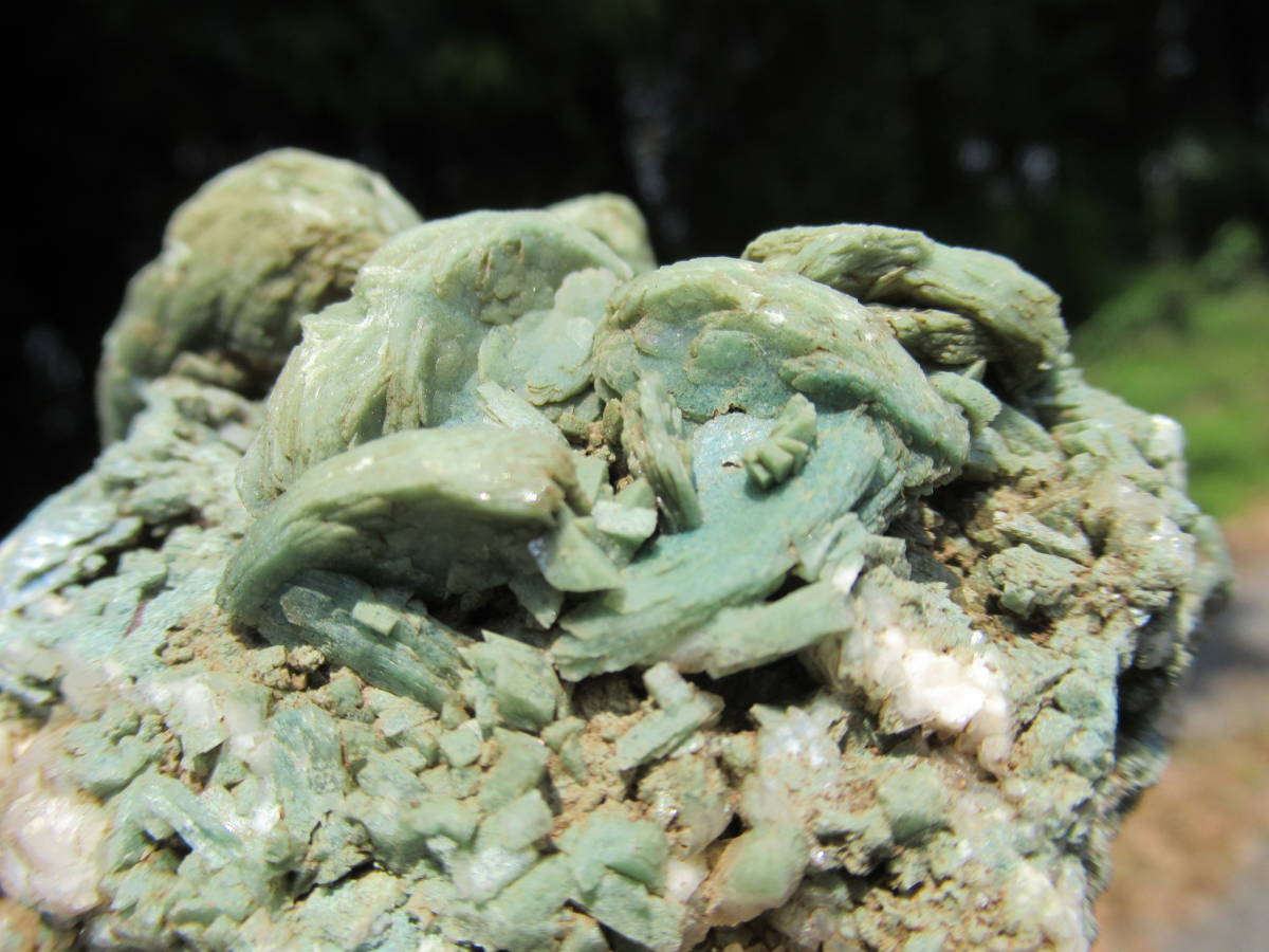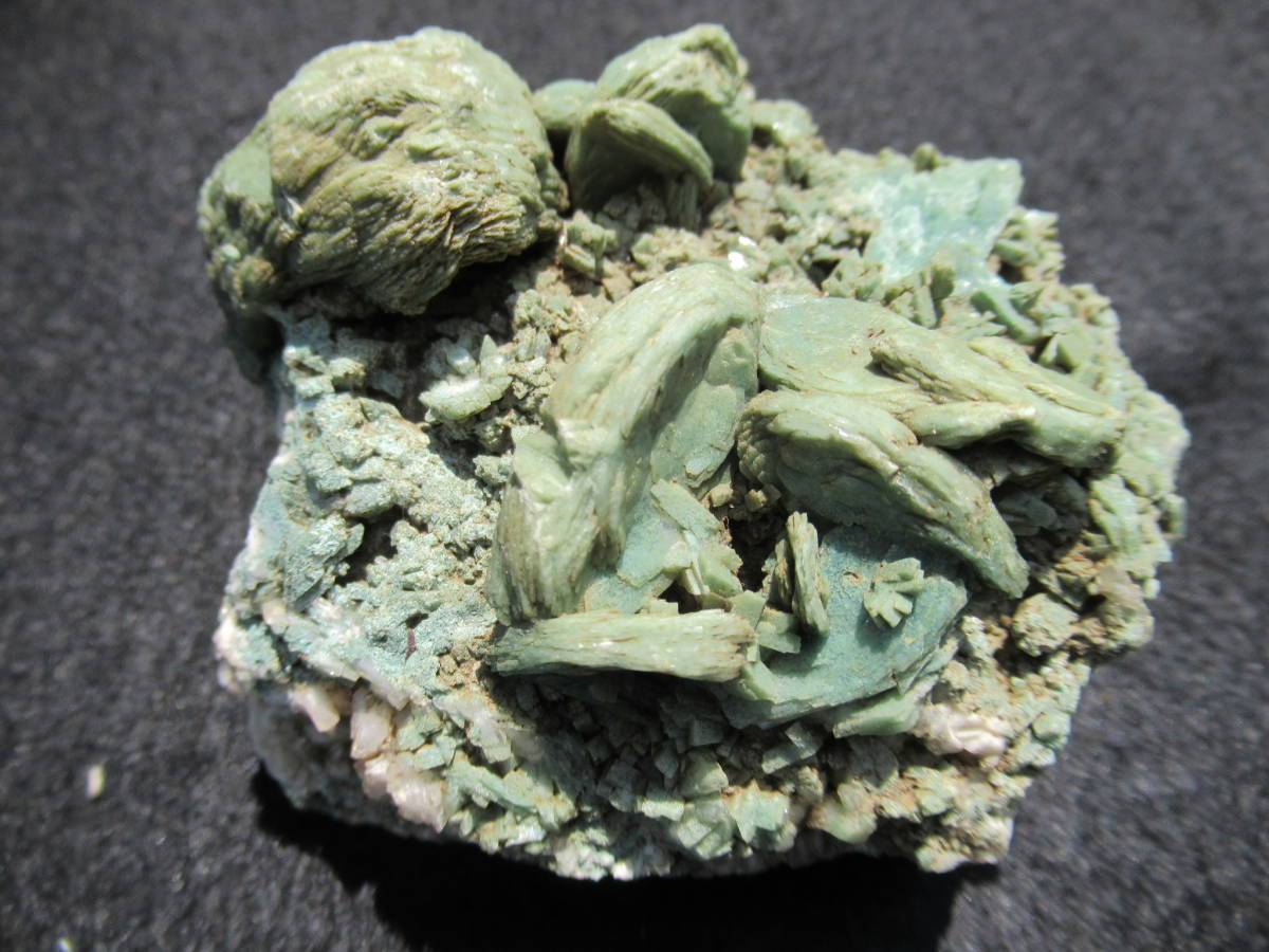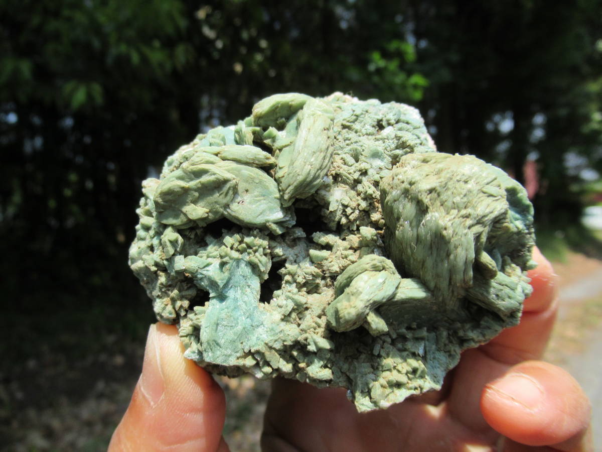インドPoona産。母岩の裏側と同様の緑泥石色の結晶の集合で、上層の大きめ集合群の下の部分にに特長的な菱形結晶集合部もあります。底面タテヨコ75/50mmほど、全体の高さ45mmほど。結晶集合の最大長28mmほど。送料無料。