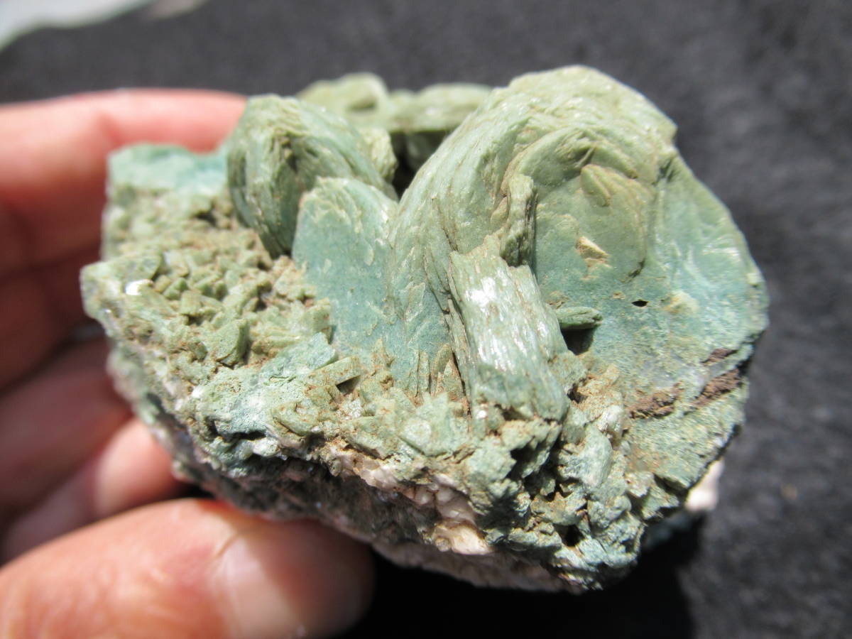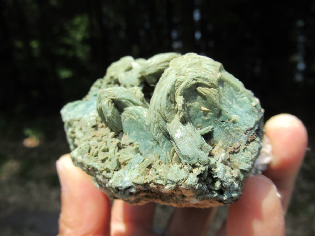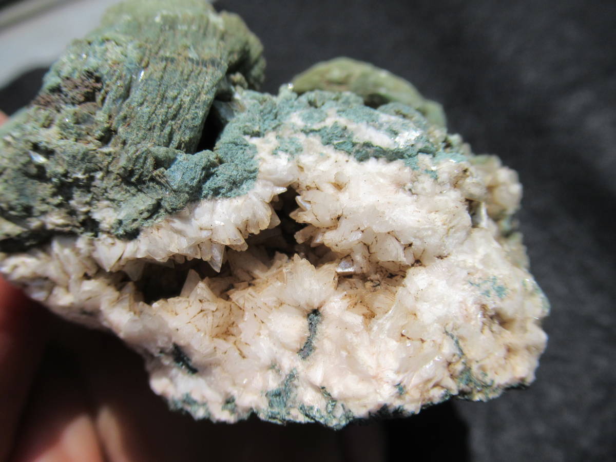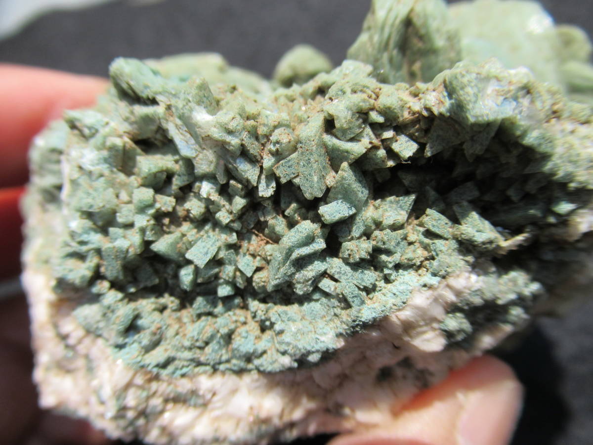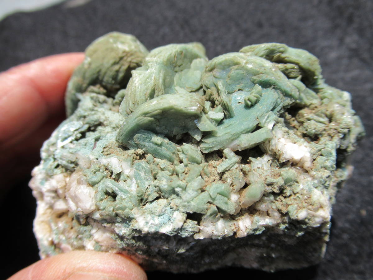 インドPoona産。母岩の裏側と同様の緑泥石色の結晶の集合で、上層の大きめ集合群の下の部分にに特長的な菱形結晶集合部もあります。底面タテヨコ75/50mmほど、全体の高さ45mmほど。結晶集合の最大長28mmほど。送料無料。