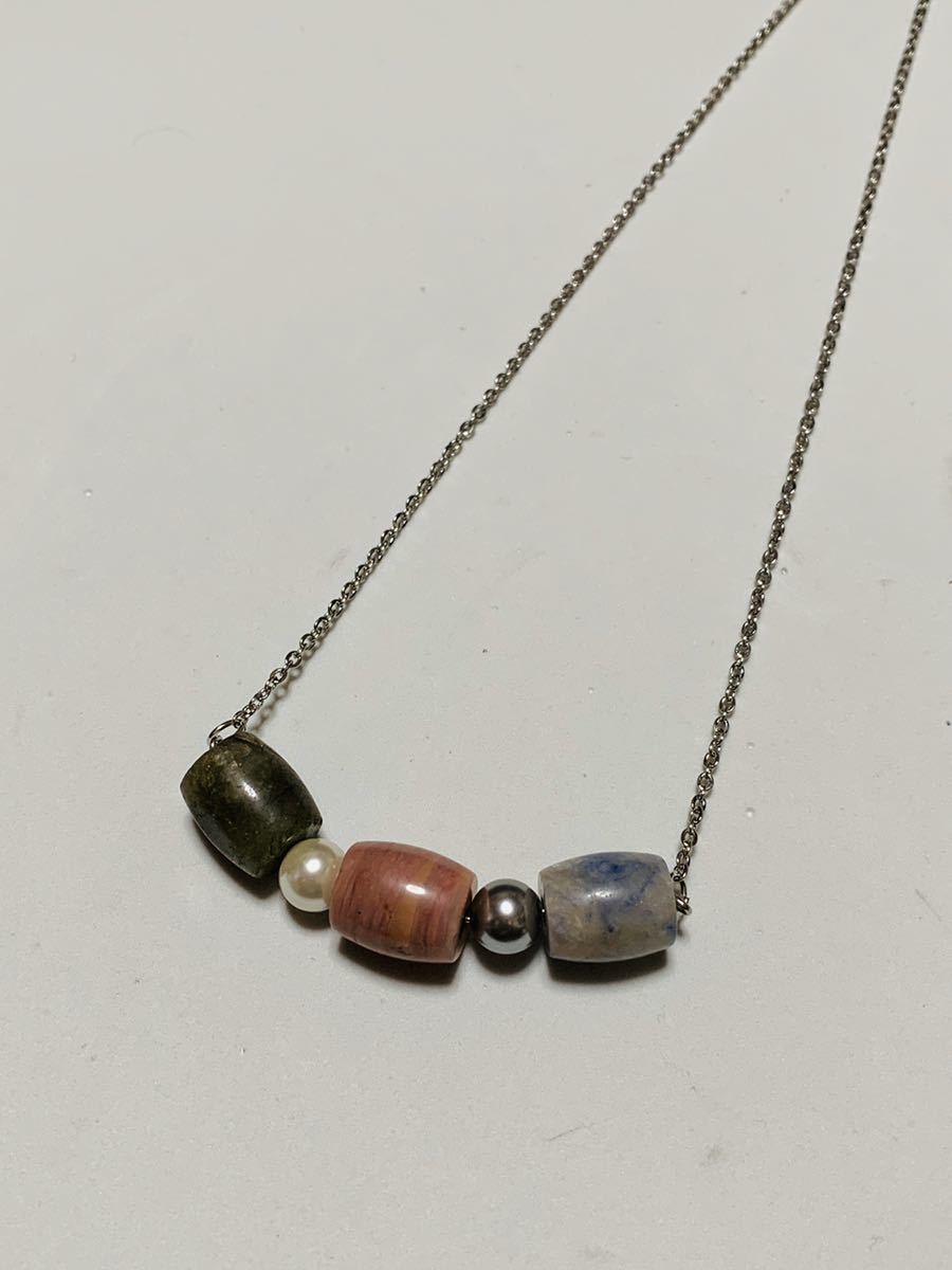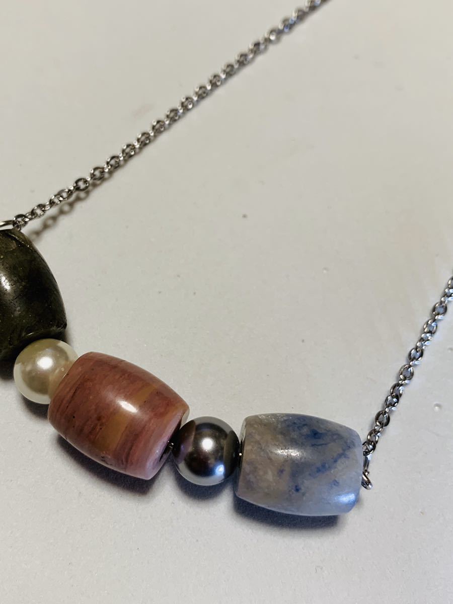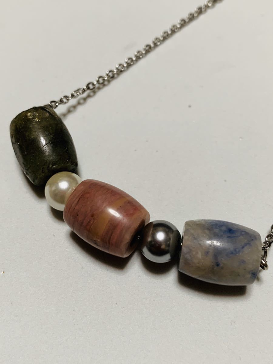 天然石とパール?のネックレスです、トップのサイズの一個は10×15ミリ、パールは直径7ミリ、チェーンに長さは50センチです