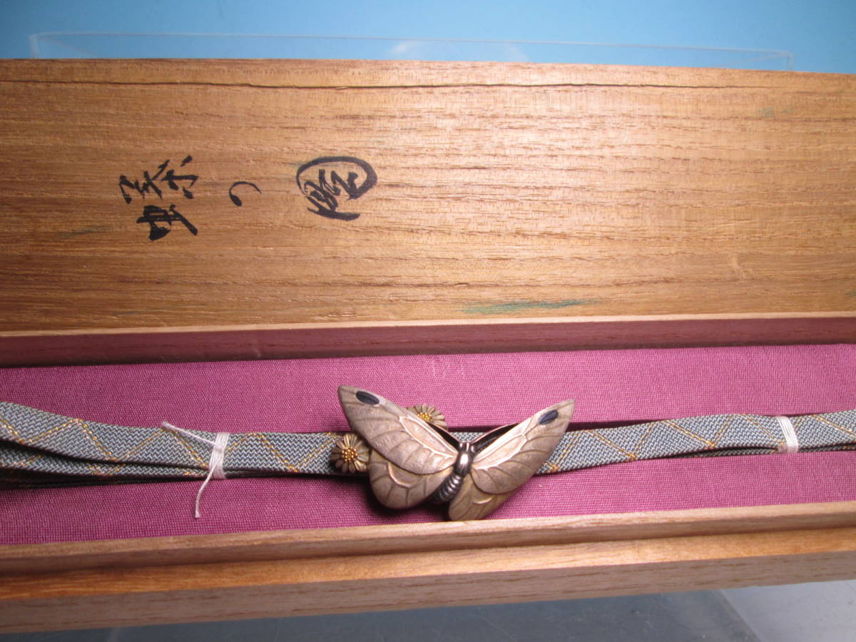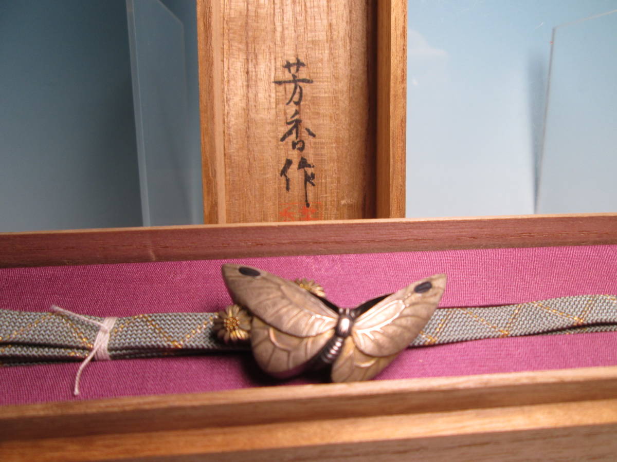 【江月】アンティーク・金工師 芳香造 金工銀彫金蝶帯留め 木箱付