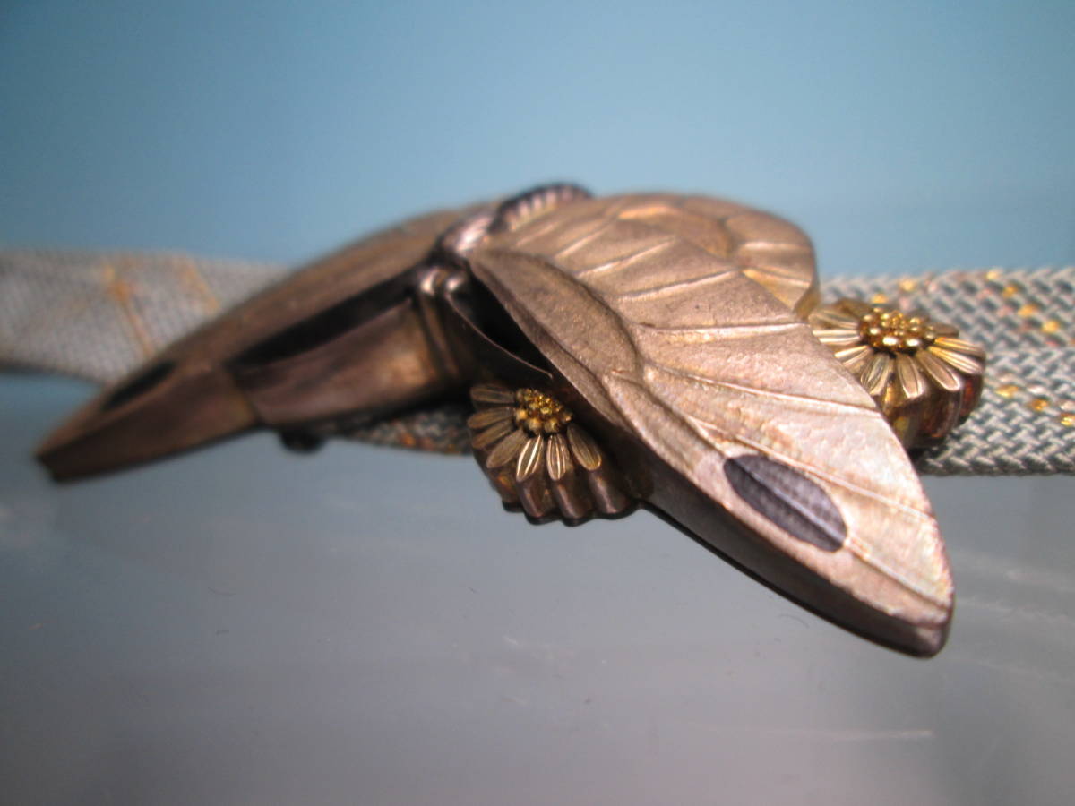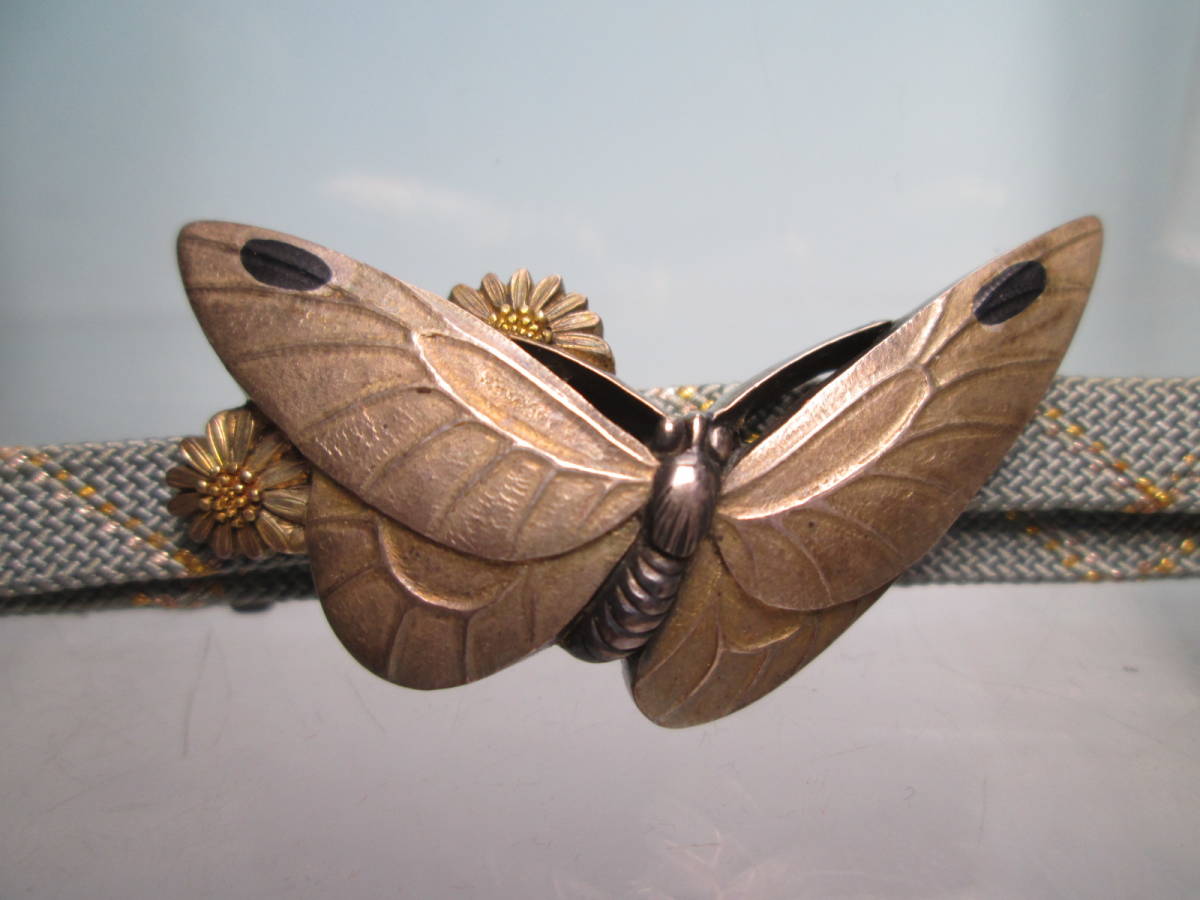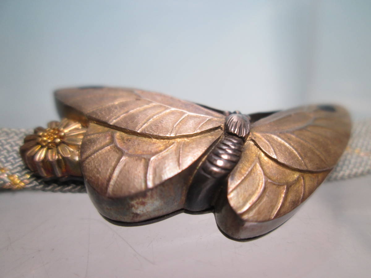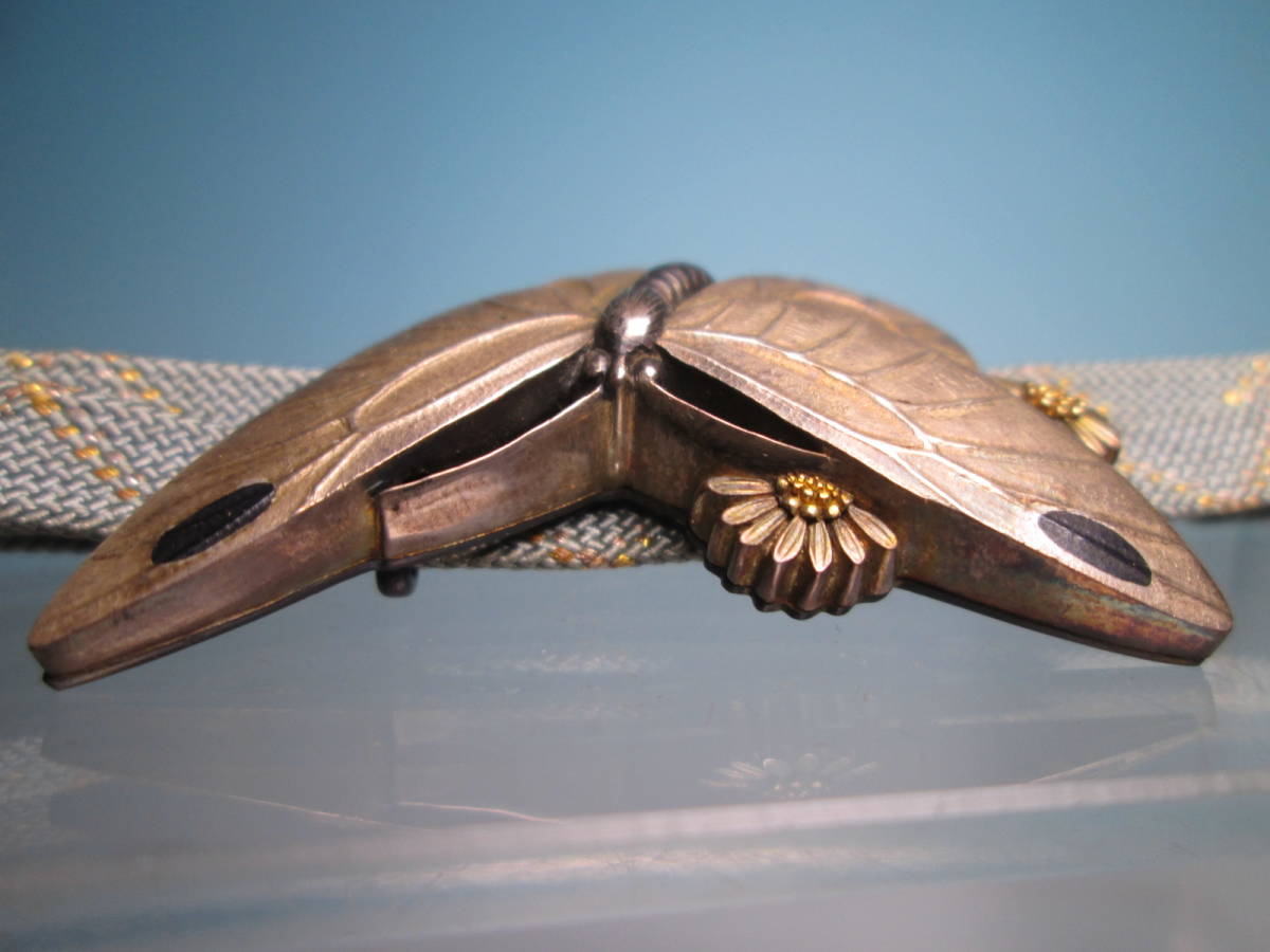 金工師による美しい彫金細工の蝶に菊花の帯留めです。鍍金がなされ、蝶の羽にも緻密で素晴らしい細工が施されています。刻印は有りません。