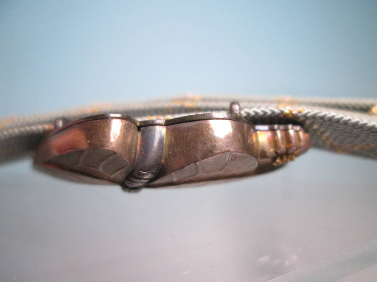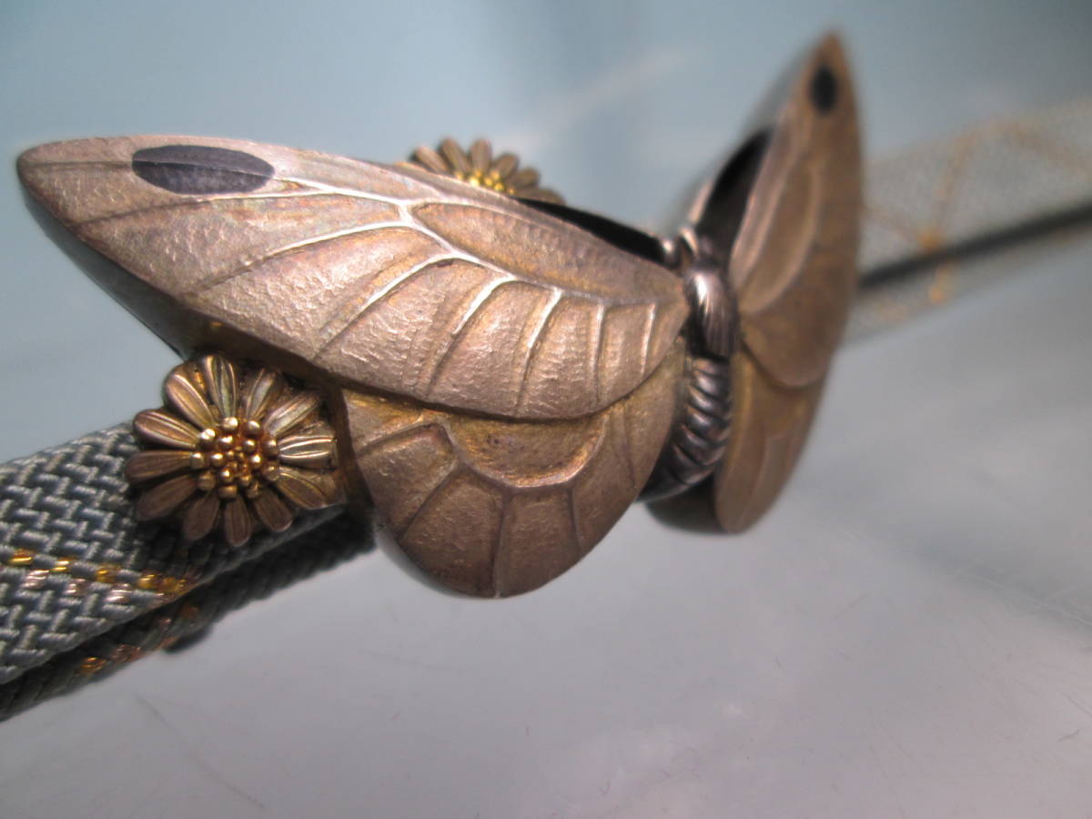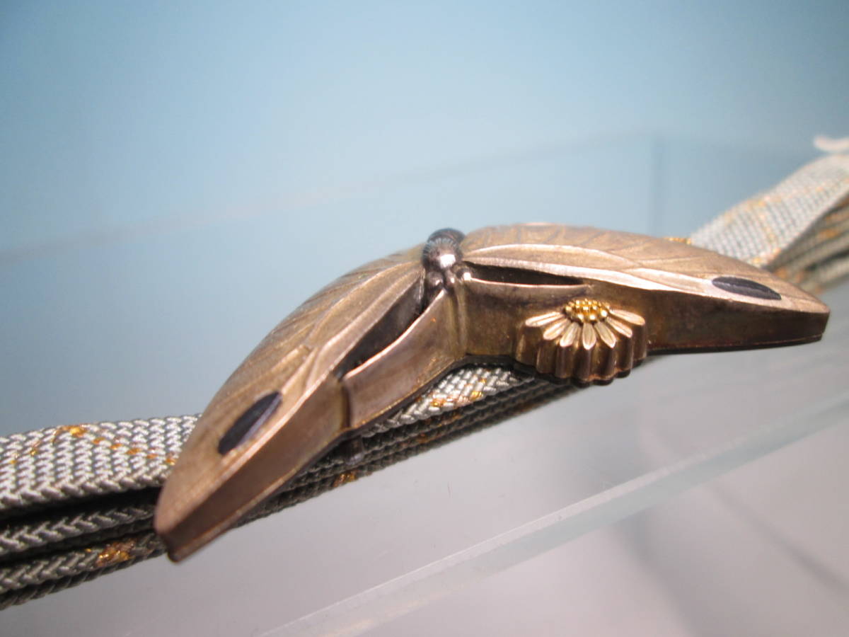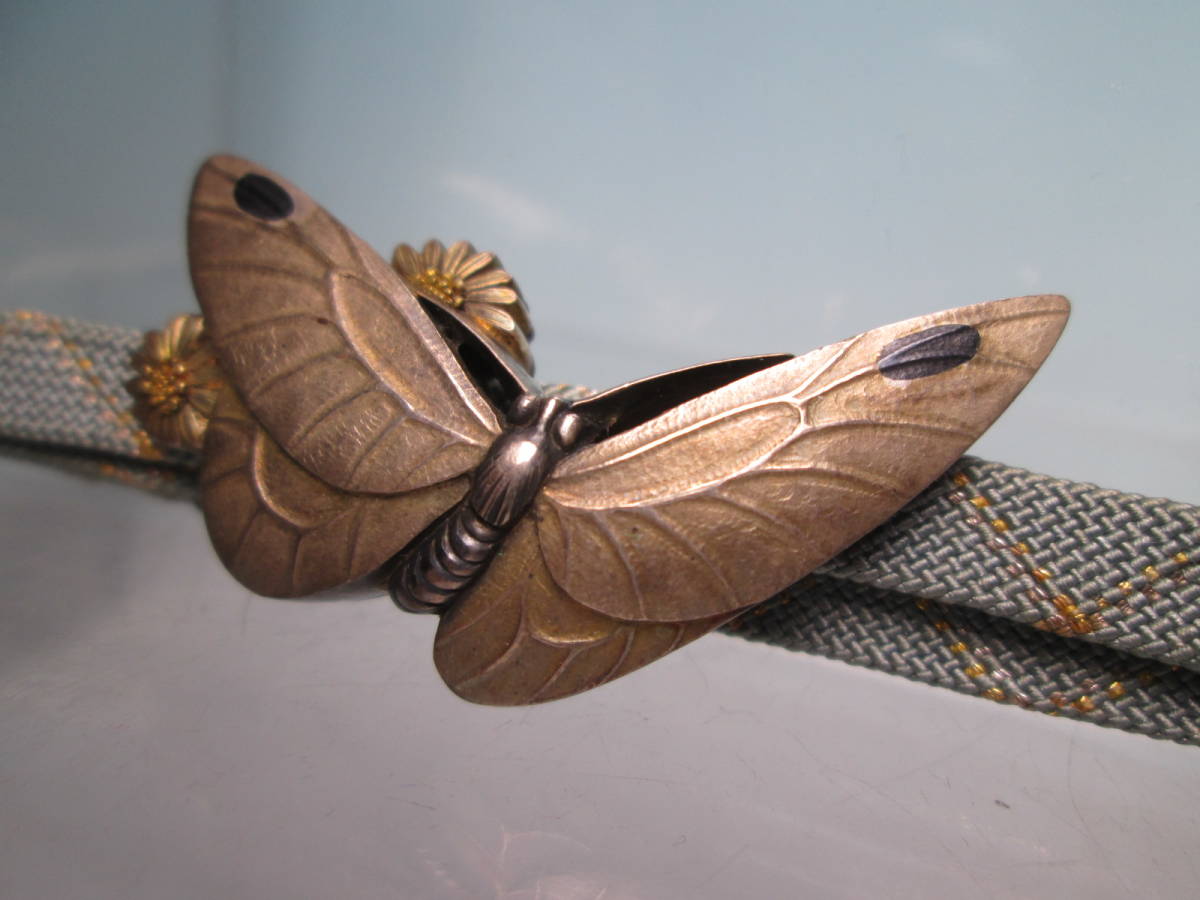 金工師による美しい彫金細工の蝶に菊花の帯留めです。鍍金がなされ、蝶の羽にも緻密で素晴らしい細工が施されています。刻印は有りません。
