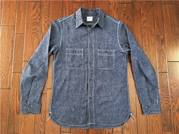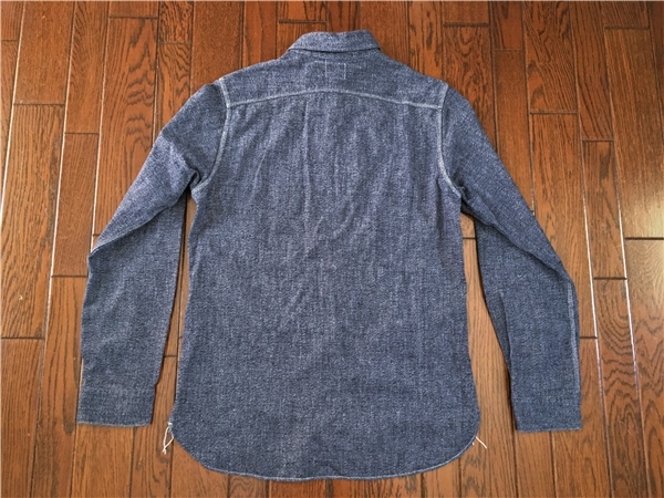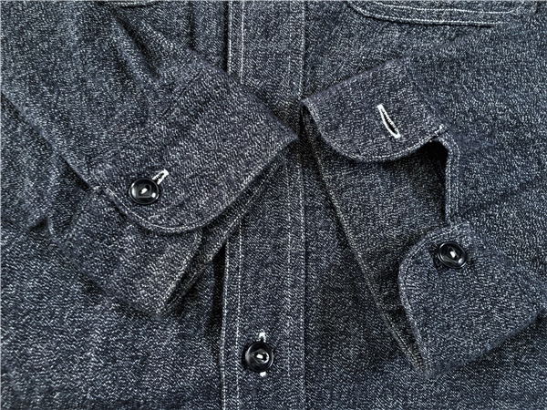 シャンブレーのようなごま塩の感じですがシャンブレーよりも少しだけ厚みがございます(デニムシャツほど厚みはございません)。