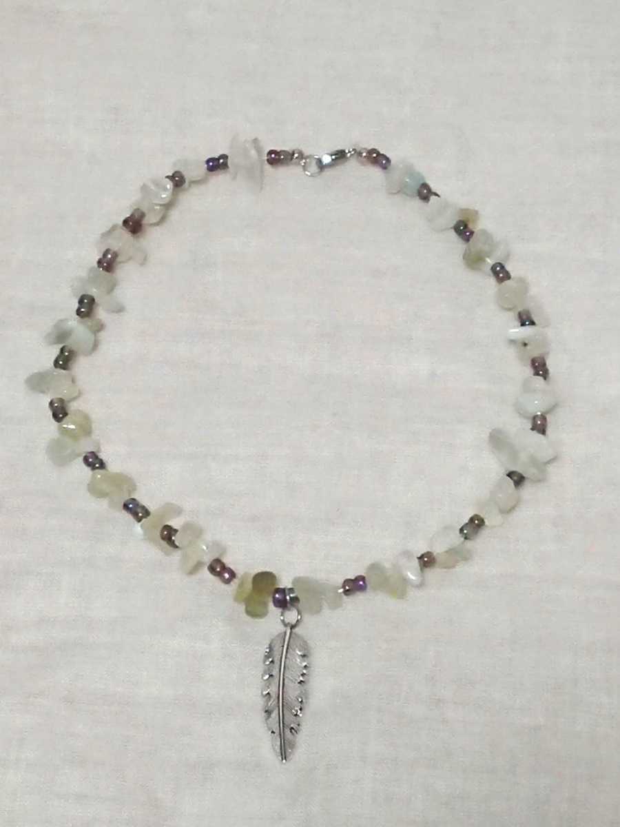 太さ5号のテグスにに大きさ4mmの玉虫パープルのシードビーズと天然石の翡翠のさざれ石を通してチョーカーを作りました。