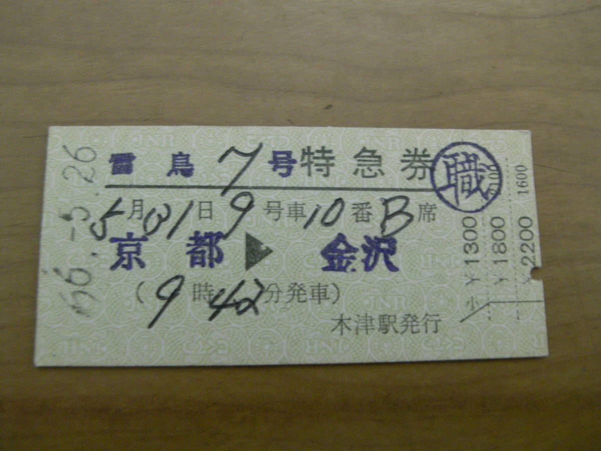 雷鳥7号 特急券 京都→金沢 昭和56年5月26日発行 木津駅発行