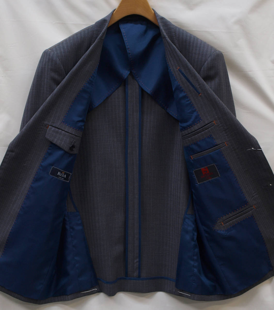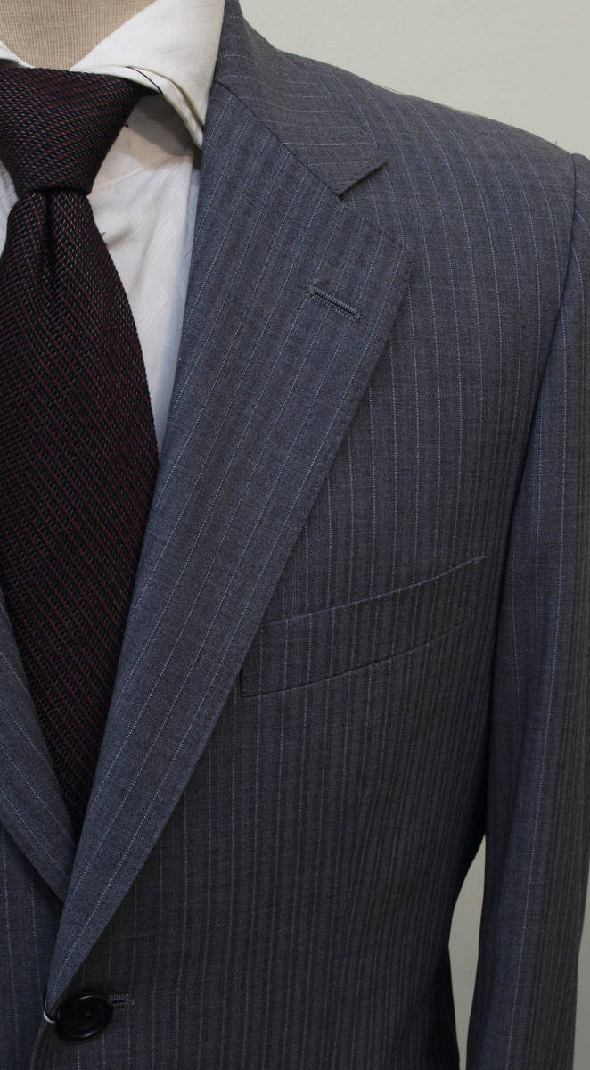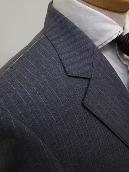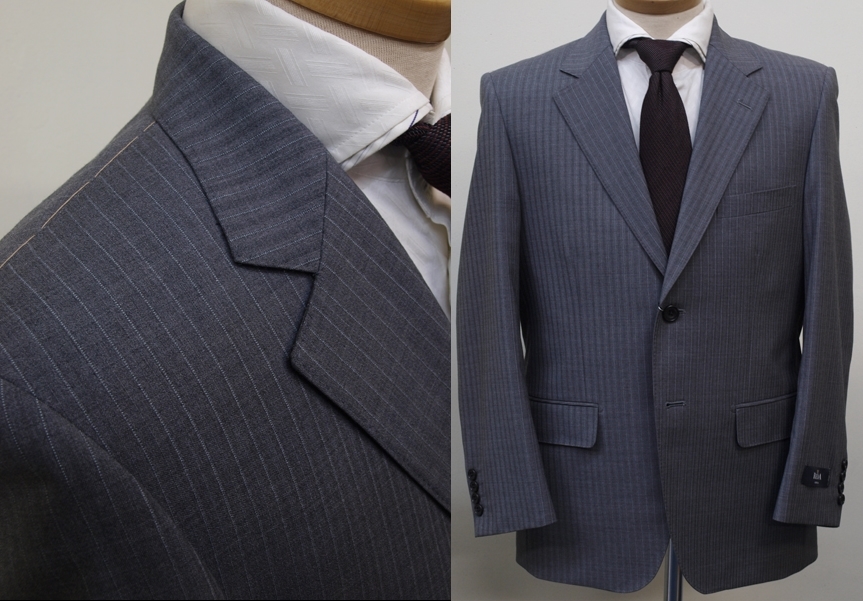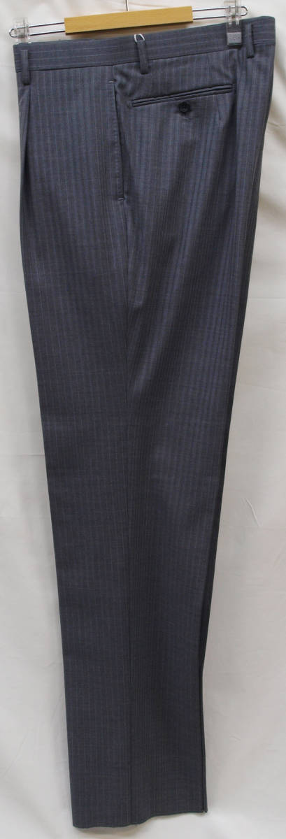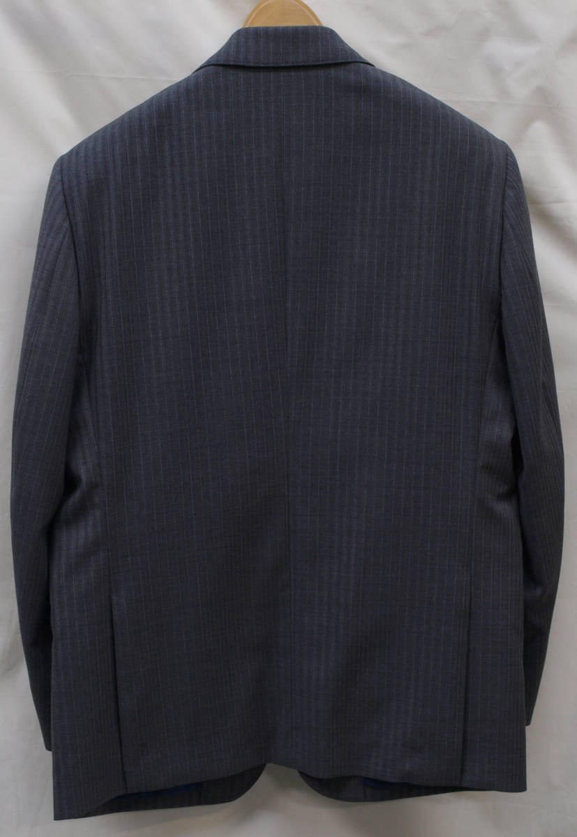 【サイズ】 AB4 (ABS号相当) 目安の体型 身長160cm~170cm、ウエストサイズ84cm前後 【ジャケット実寸】 肩幅46cm 着丈69cm 袖丈58.5cm 脇下部分53cm 身幅49cm 【パンツ実寸】 ウエスト(胴回り実寸)84cm わたり幅34.5cm 股下10cm部分31.5cm 裾幅22.2cm 脇股上26cm 前股上27.5cm 股下87cm(裾上げしていない状態/新品) 【素材】 表地:ウール(毛)100% 裏地:胴裏/ポリエステル100% 袖裏/ポリエステル100% ・イタリア、 レダ社(REDA)のSUPER110'S生地を使用 高級イタリア製生地特有のなめらかでさらっとした触り心地の上質な素材です。 【色】 明るめミディアムグレー 【柄】 ライトブルーグレーのラインがはいったストライプ柄 【デザイン】 細すぎずかといってゆとりがありすぎることなく、体型に無理なくきれいにフィットする、シングル2つボタンスーツ、レギュラーフィット、ビジネススーツ新品、裾上げしていない状態です。 ・ジャケットはシングル2つボタンでレギュラータイプ ・パンツは股上は浅くなくウエストラインで履くタイプで少しだけゆとりをもたせたちょうど良いくらいのすっきりシルエットのワンタックスラックスです。 春先~夏~秋口にかけて春夏メインのシーズン対応商品 メーカー希望小売価格 税込み62640円 【縫製仕様】 ・ジャケットはシングル2つボタン、ノッチドラペル、襟元等AMFステッチ入り、袖口ボタン4つ、サイドベンツ、内ポケット4つ(小ポケット2つ含む)、背抜き(春夏物) ・パンツはワンタック、膝裏当て付き、脇ポケット縦付け、後ろポケット両玉縁で左のみボタン付き、フロントはファスナーでホック仕様/うちかけボタンあり、シャツ滑り止め付き 使用付属(肩パット、毛芯等)もワンランク上のを使い、細部まできれいな縫製仕立てで仕上がっております。