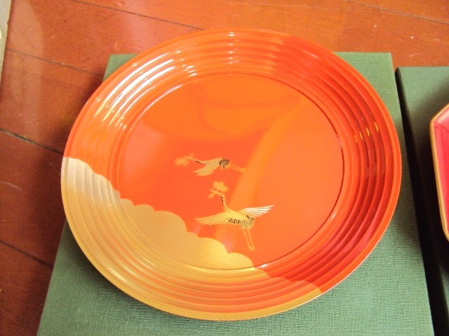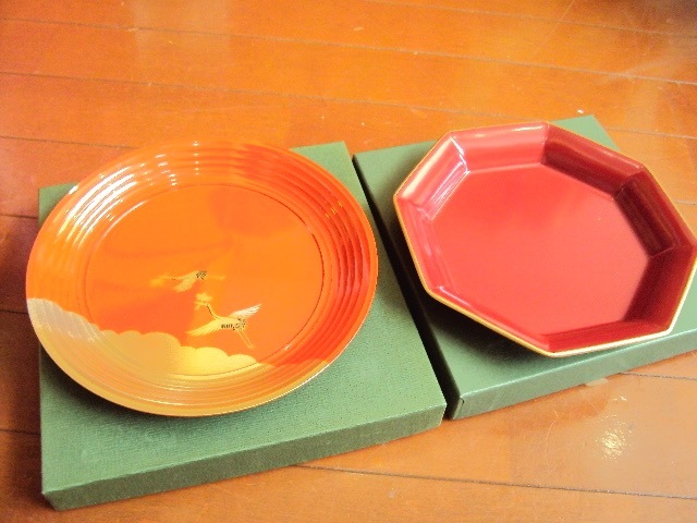 未使用品です。漆器2個です。サイズは鶴柄直径19.5cm、高さ2.2cm、8角形直径17.9cm、高さ2.2cm位です。箱は傷んでいます。自宅保管品ですので神経質な方は御遠慮下さいね。ノークレームノーリターンでお願い致します。その他いろいろ出品していますので見て下さいね。 必ず自己紹介も御覧下さいね