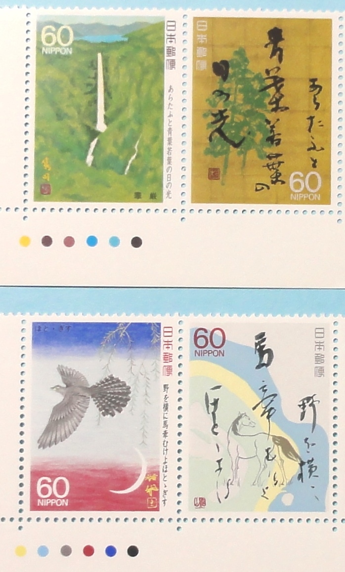 奥の細道 第1集 あらたふと青葉若葉の日の光& 第2集 野を横に馬牽(うまひき)むけよほとゝぎす 松尾芭蕉◆未使用◆記念切手 カラーマーク