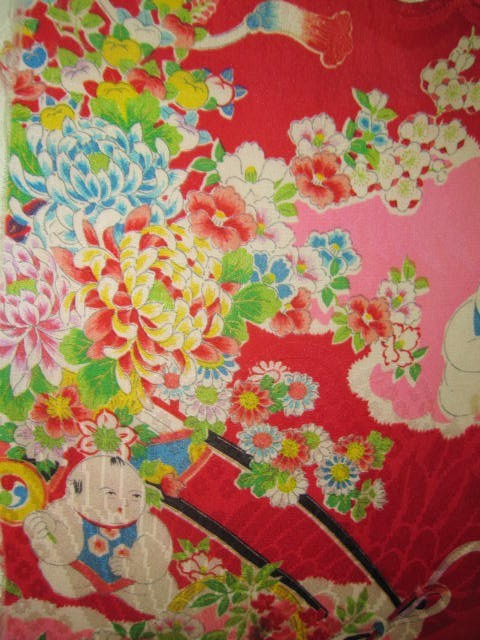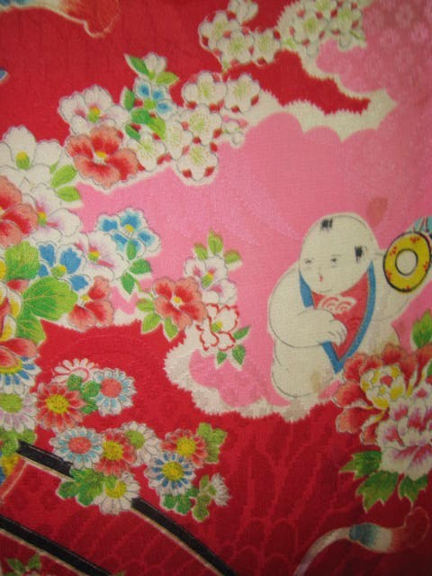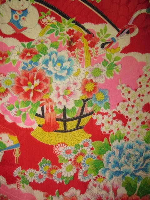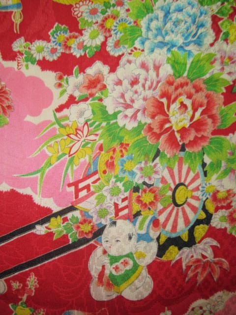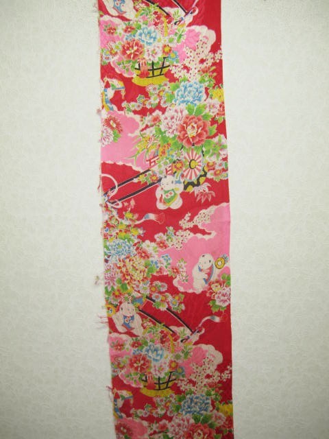 着物古布=37★赤ピンク*唐子*花車*牡丹*菊*椿*立花*綸子*古布はぎれ★人形/吊るし雛