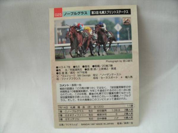 | ☆☆☆商品説明☆☆☆ 【メーカー】 バンダイ 【シリーズ】 96年下半期サラブレッドカード 【番号】 025 ノーブルグラス 【種類】 GⅢカード 【数量】 1枚 サラブレッドカードの第3弾96年下半期カードになります。 |