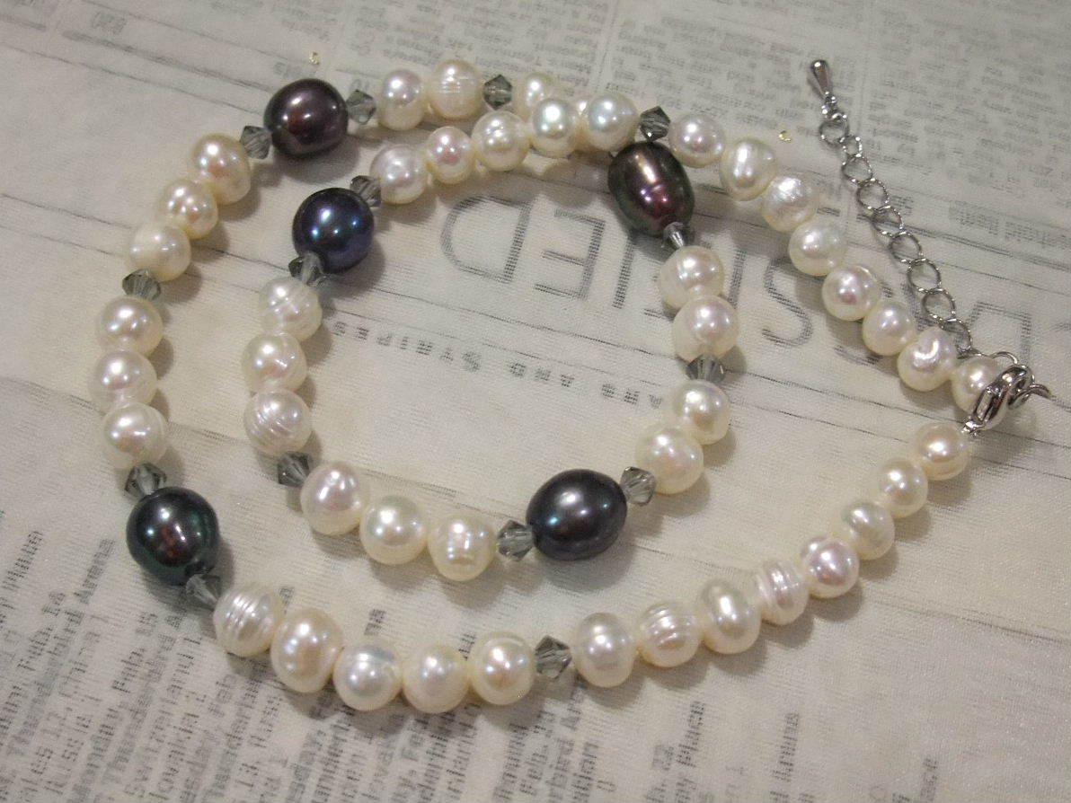 人気セミラウンド系白真珠とオーバル系大粒黒真珠ネックレス淡水真珠♪テリツヤ綺麗なナチュラル系白真珠と大きめ粒黒真珠、キラキラのカットの綺麗なクリスタルカットグラスのクールなお上品系♪淡水真珠の高品質ややバロックセミラウンドポテトで南洋真珠のようなサークル入りでラインに動きのあるタイプ♪♪お素材として使ってもお得で、この価格なら初心者の方でも気軽に製作にお使いいただけます♪♪