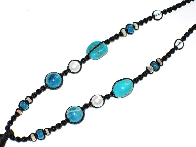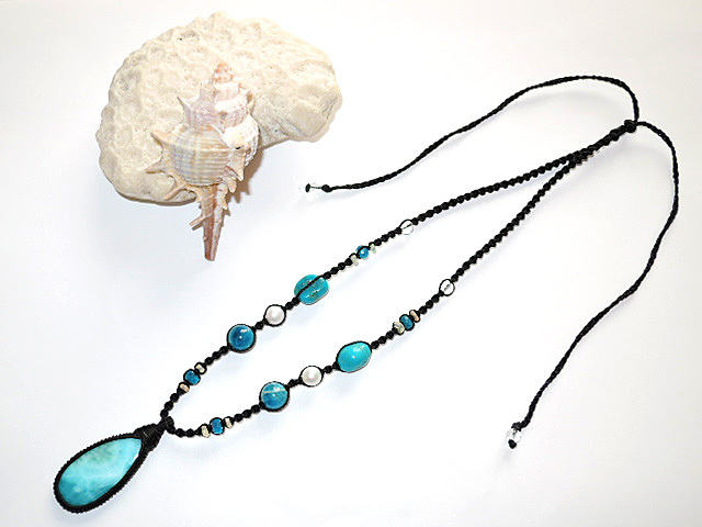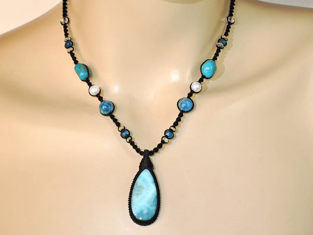 ★癒しのラリマー28ct★天然石ネックレス★総編み込みペンダント★ビーズネオンブルーアパタイト+淡水パール他宝石★kamesan