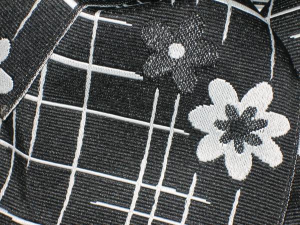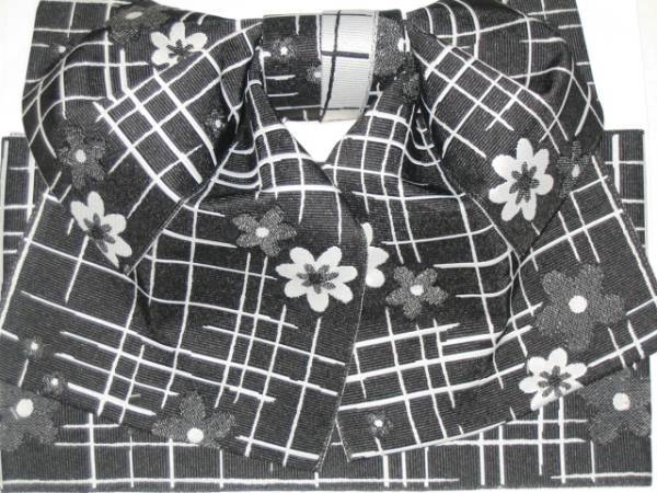 女性浴衣用、地紋柄結び帯  くろ  ポリエステル  新品(織り地紋柄ありです。波状の写りはレンズの光学的ないたずらで現品にはありません、また薄く濃く写っている場合もあります)、胴部--帯巾約17,0cmx長さ約130cm、リボン部は横に約30cm。見た範囲で汚れないと思いますので、着用には問題ないと思います、。なお処分特価で出品です。