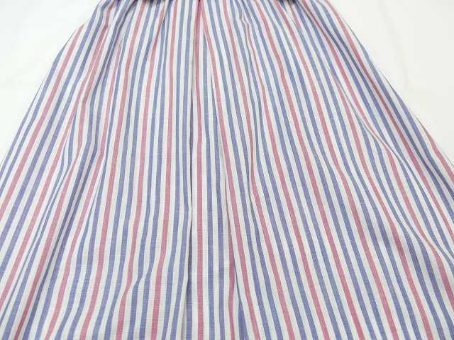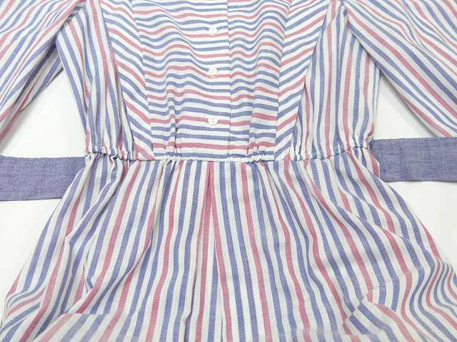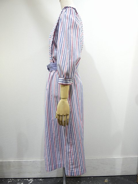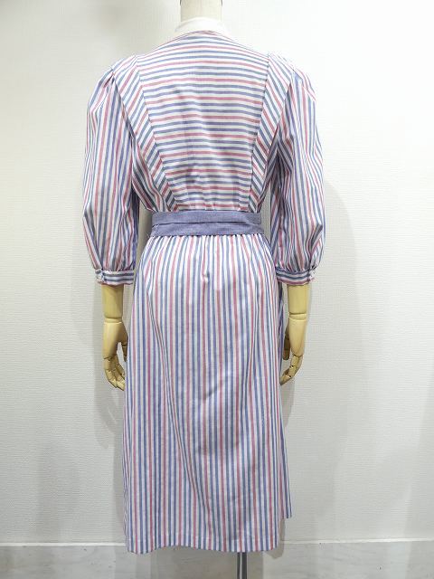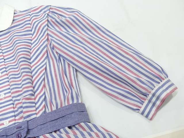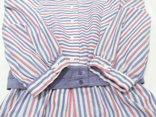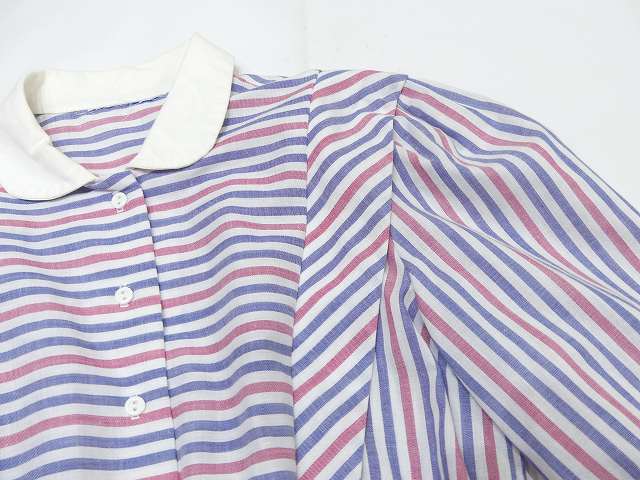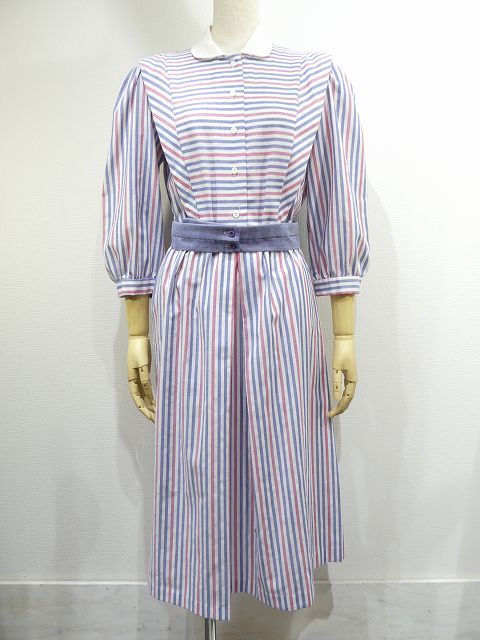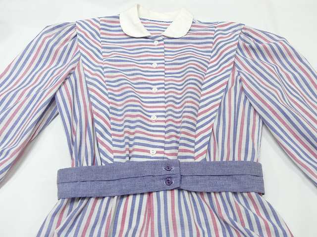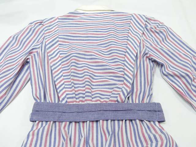 | こちらは、70年代頃~のストライプ ビンテージ ワンピースです。 パープルブルーとレッドのストライプの配色はレトロで白い襟や、付属のベルトも良いポイントです。シンプルなデザインですが、身頃前後生地を横に使ってボーダーにしてみたり、肩からタックをよせたりと、要所要所こだわりのある作りです。裏地はございません。ウエストゴムで着心地も良くシルエットも綺麗です。是非さらりと着てみてはいかがでしょう。 コンディションは多少の使用感はございますが、ダメージも無く良好です。 素材 コットン×ポリエステル サイズ (着用感Mサイズ) 肩幅37.5cm 身幅98cm 袖丈47cm ウエスト約60-94cm(ゴムになっています) 着丈約112cm 撮影用BODYサイズ 肩幅37cm バスト82cm ウエスト60cm ヒップ86cm 素人採寸の為、多少の誤差はご了承ください。 |