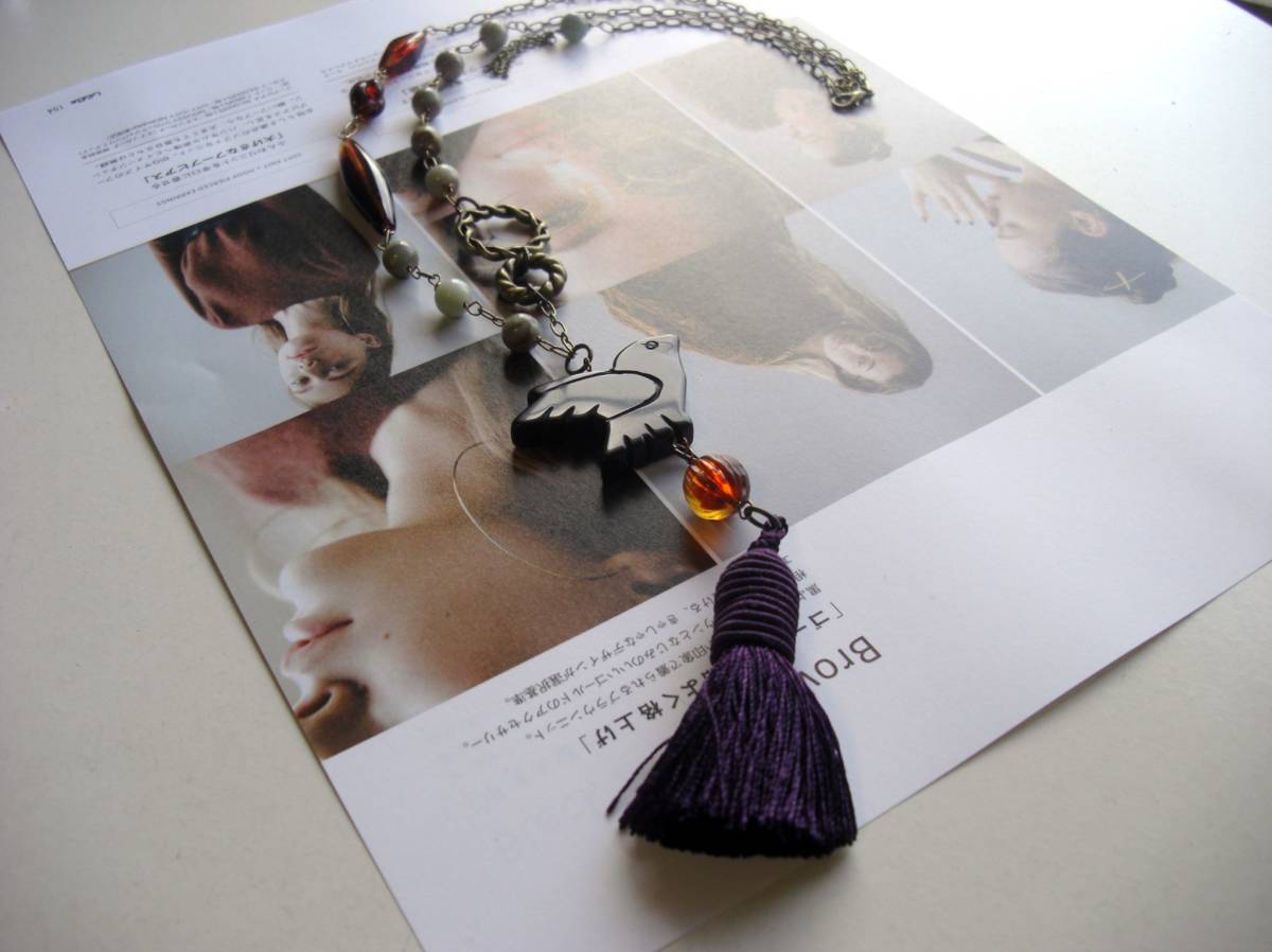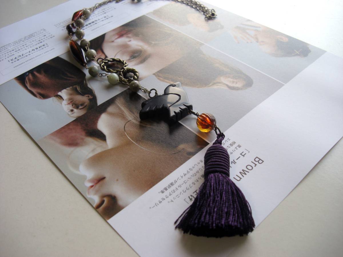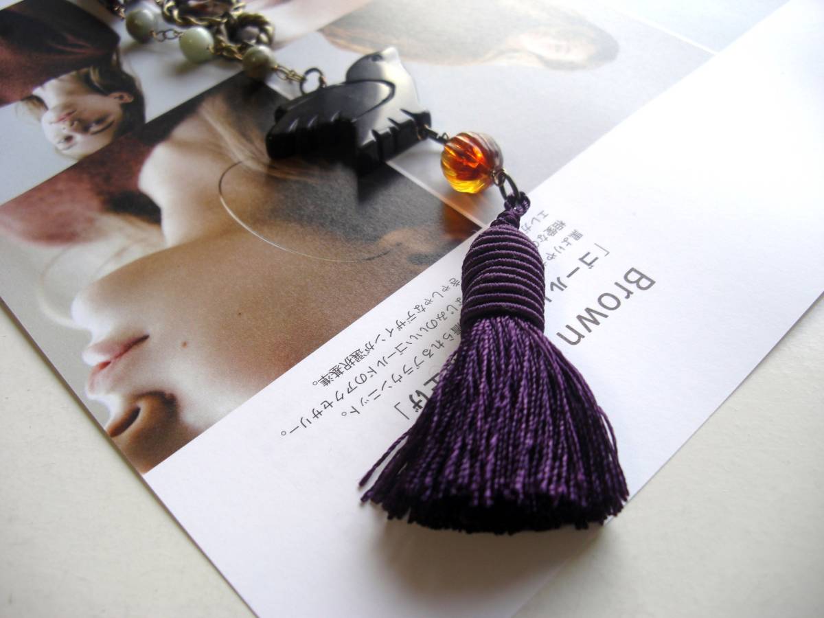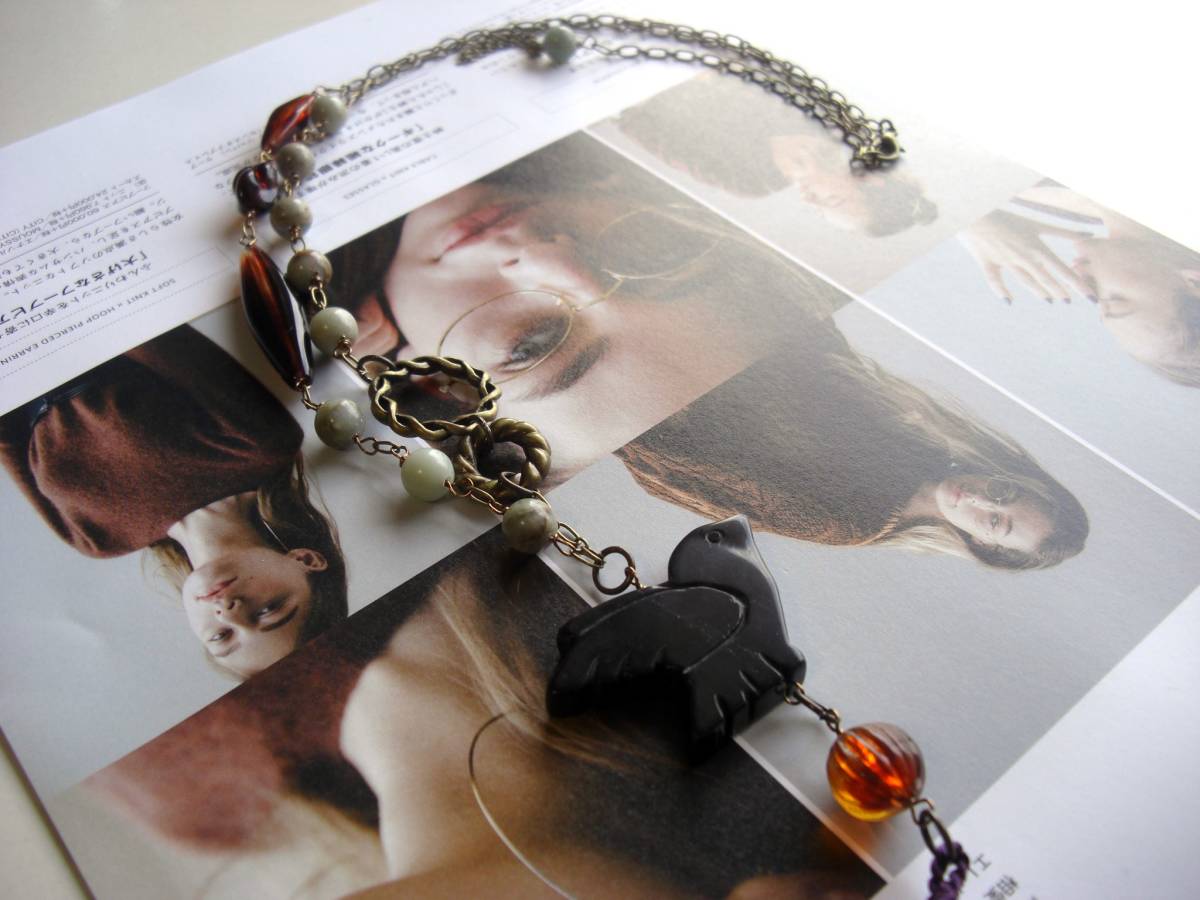 4月のクローゼット・・シリーズです♪シックなブラックオブシディアンの黒鳥とやさしいモスグリーンのインプレッションストーンのネックレスです♪8ミリのインプレッションストーンにデザインリングや樹脂ビーズを繋ぎました♪トップは40×30ミリのブラックオブシディアン、深い紫のタッセルを合わせてアンティークモダンな表情です♪長さは80センチ位で調節自由です。 トップは長さ13センチ位です♪シンプルなデザインなので長く着けて頂けると思います♪お揃いのブレスレットやイヤリングも出品しています。ハンドメイドを ご理解頂いてノークレーム、ノーリターンでお願いします!