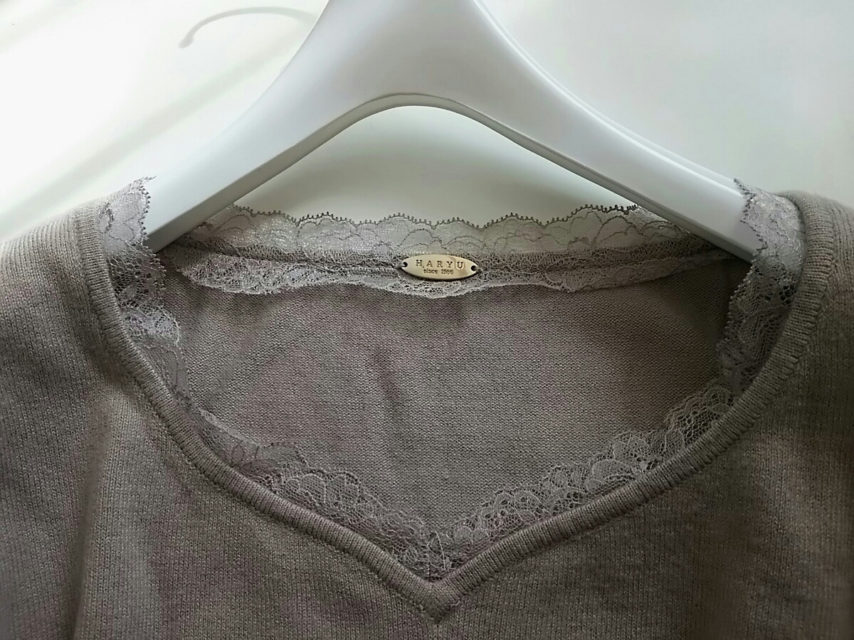 襟周りのレース、メタル製ブランドロゴタグが素敵です。