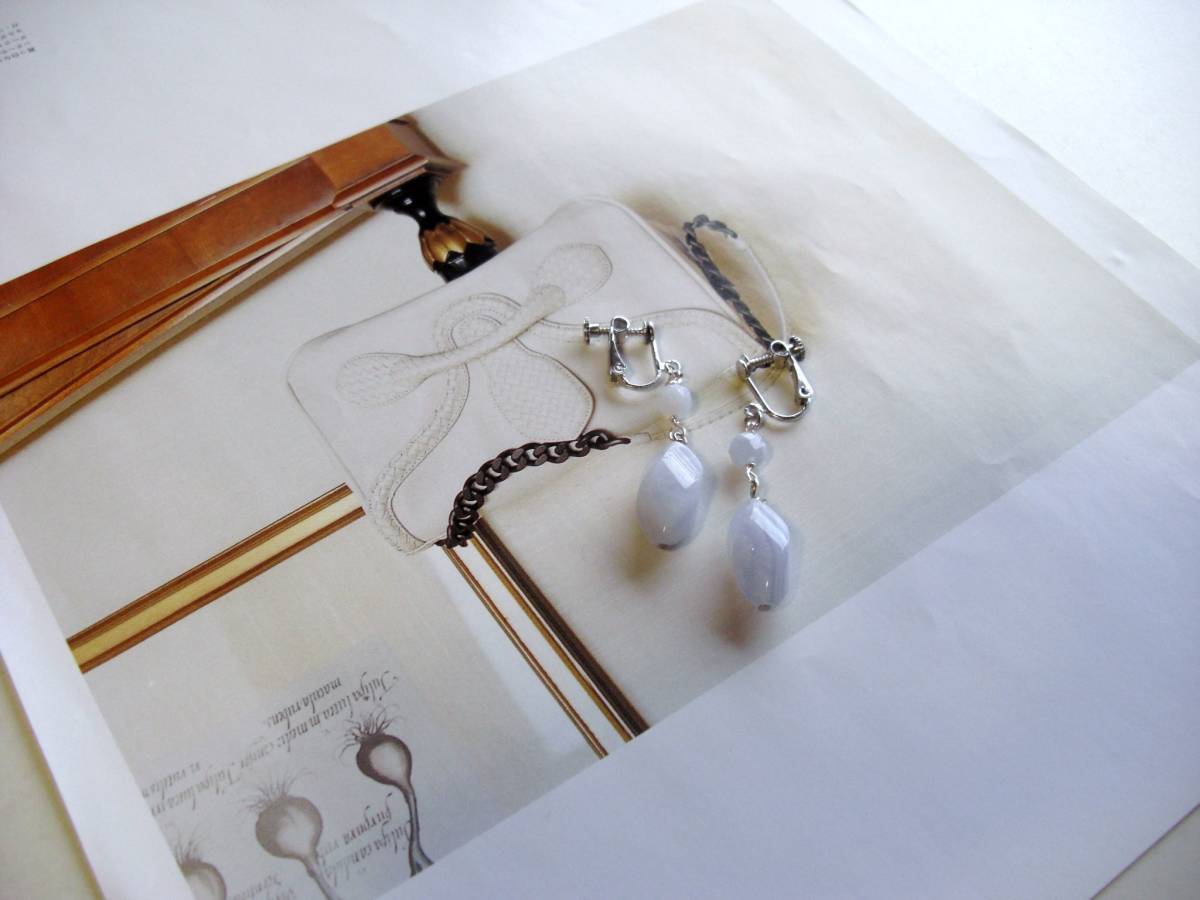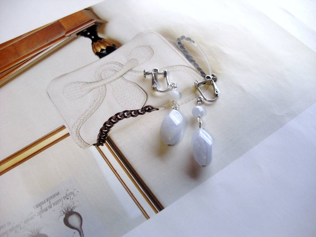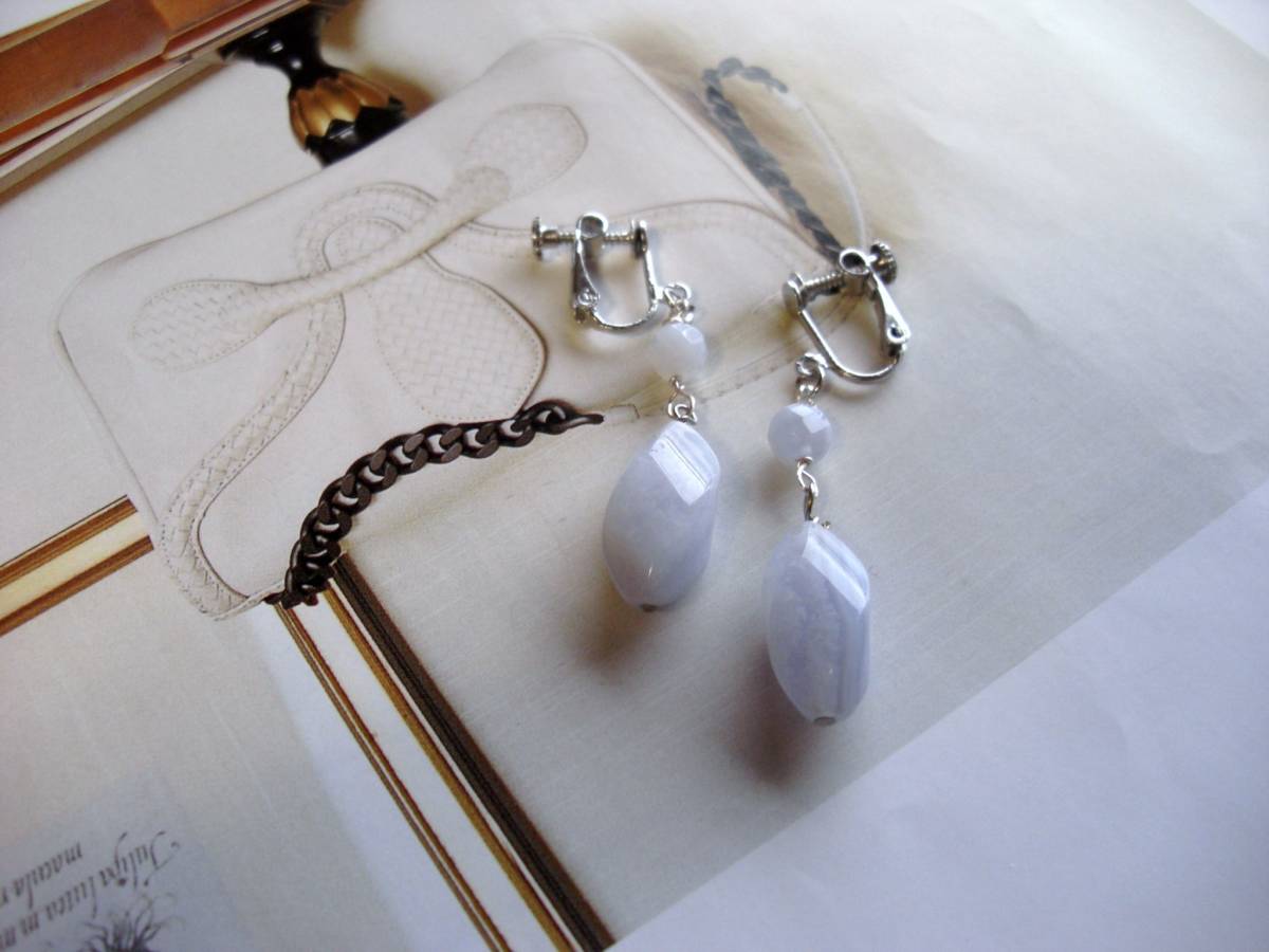 愛らしさを繋いで・・シリーズです♪ブルーレースを纏って・・爽やかな水色のブルーレースのイヤリングです♪個性的なカットの石なのでシンプルなデザイン にしました♪6ミリのランダムカット、20ミリ位のツイストカットのブルーレースを合わせてシックで大人っぽい表情で す♪長さは全長5・5センチ位です♪ピアスに変更可能です♪お揃いのネックレスやブレスレットも出品しています♪シンプルで飽きのこないいつまでも 着けられるデザインを考えて作りました!ハンドメイドをご理解頂いてノー クレーム、ノーリターンでお願いします