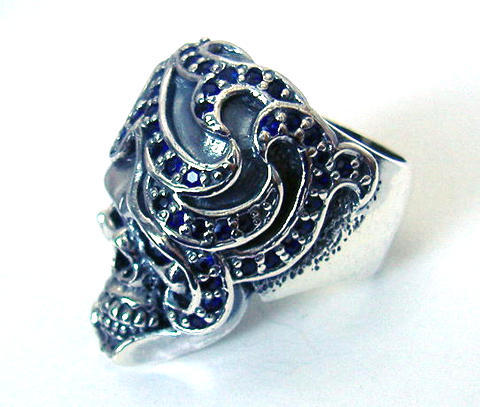 スカルの目や髪にサファイヤタイプのジルコニアが入ったリングです。