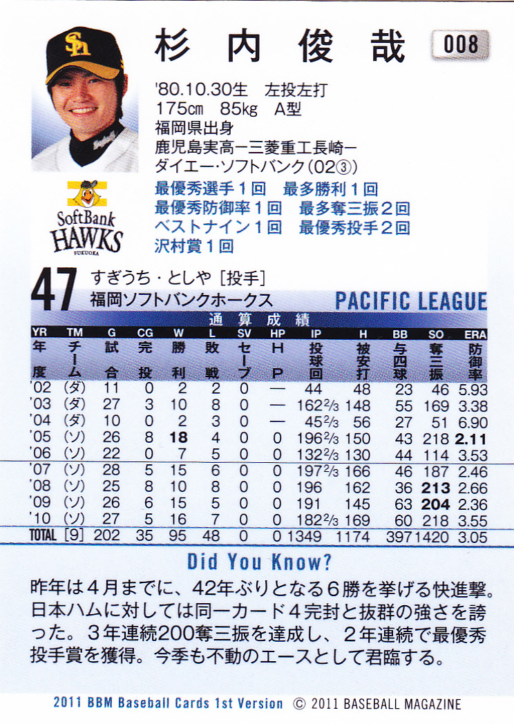 2011BBMベースボールカード1st 008 杉内俊哉 ソフトバンク 福岡県 鹿児島実業高校 ダイエー 沢村賞 ベストナイン